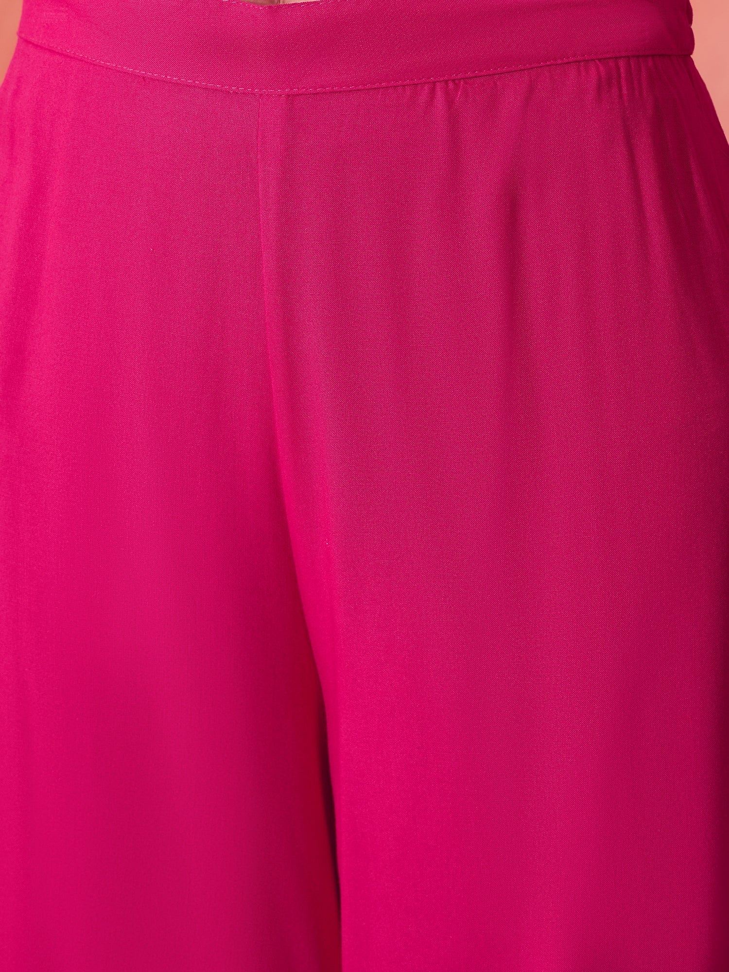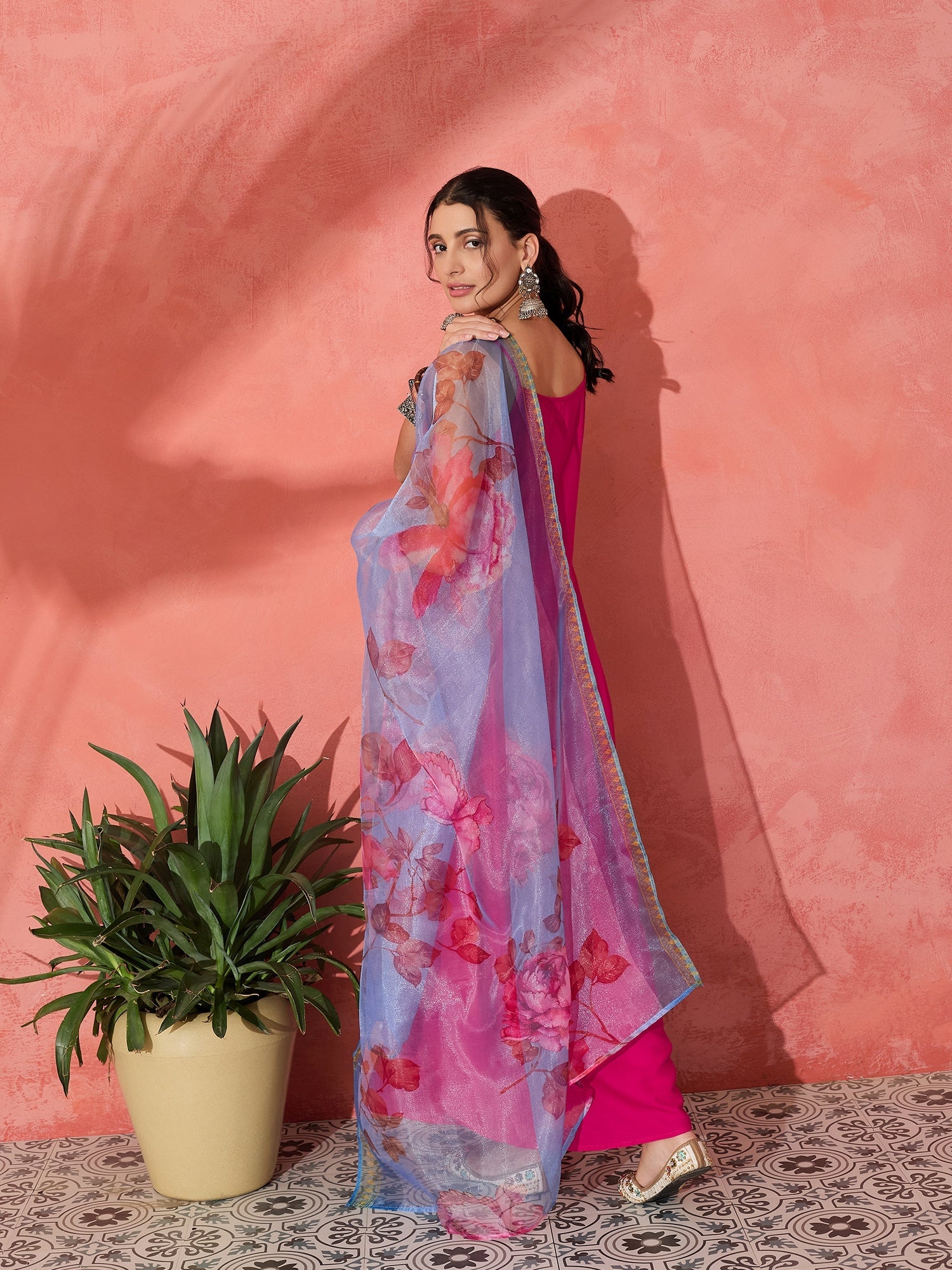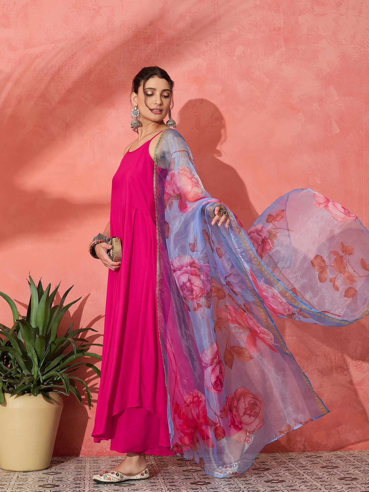 The Fuchsia Strappy Set with Blue Fuchsia Organza Dupatta is a fashionable choice that combines modern style with traditional elegance, making it a perfect outfit for those who love to make a statement!