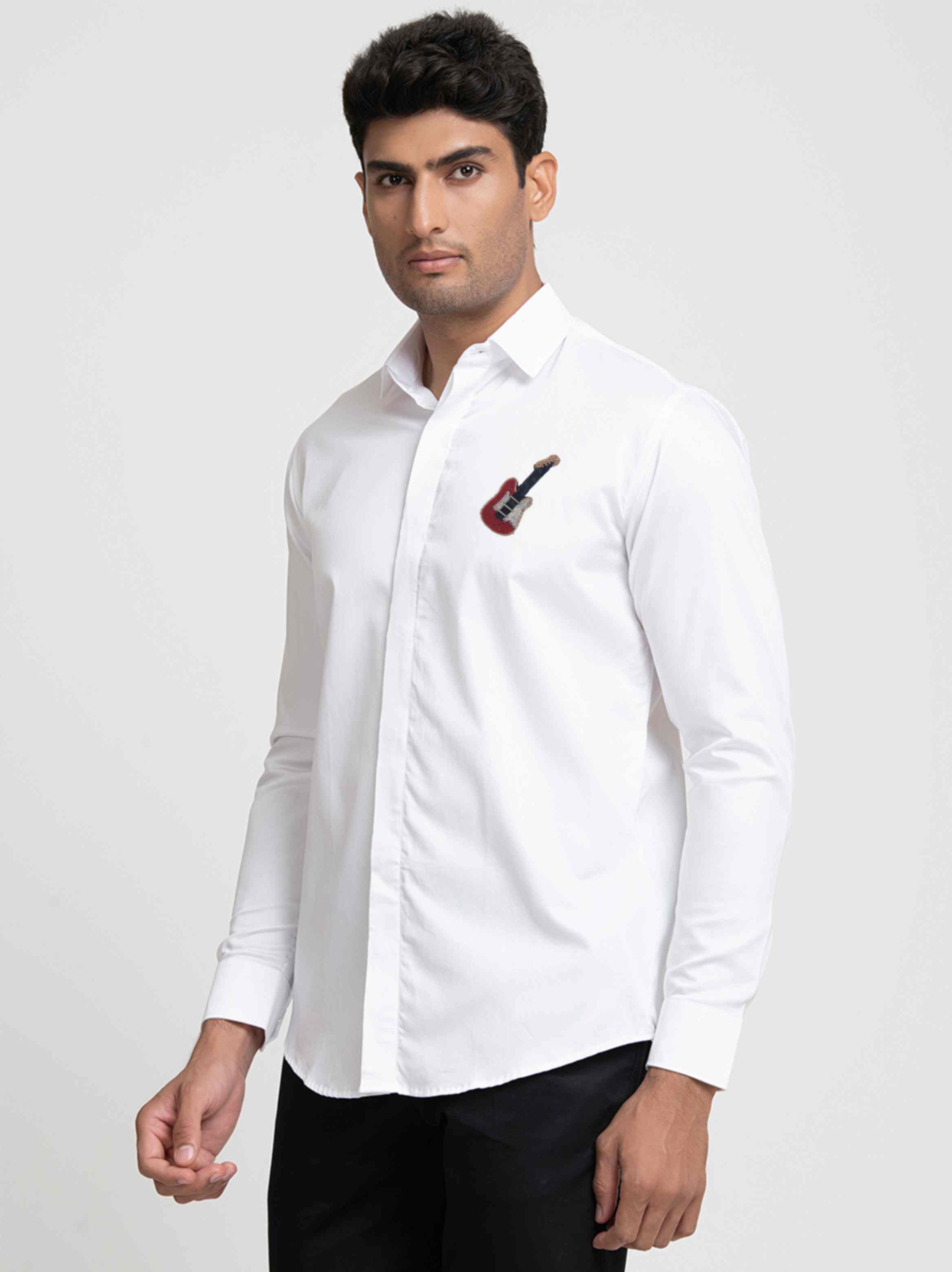 The intricate guitar embroidery, meticulously crafted with dazzling cutdana, beads, and sequins. The hidden buttons provide a seamless look, while the harmonious design captures the essence of melody. Whether you're a music enthusiast or a fashion aficionado, the Melodorn shirt strikes the perfect chord between elegance and creativity.