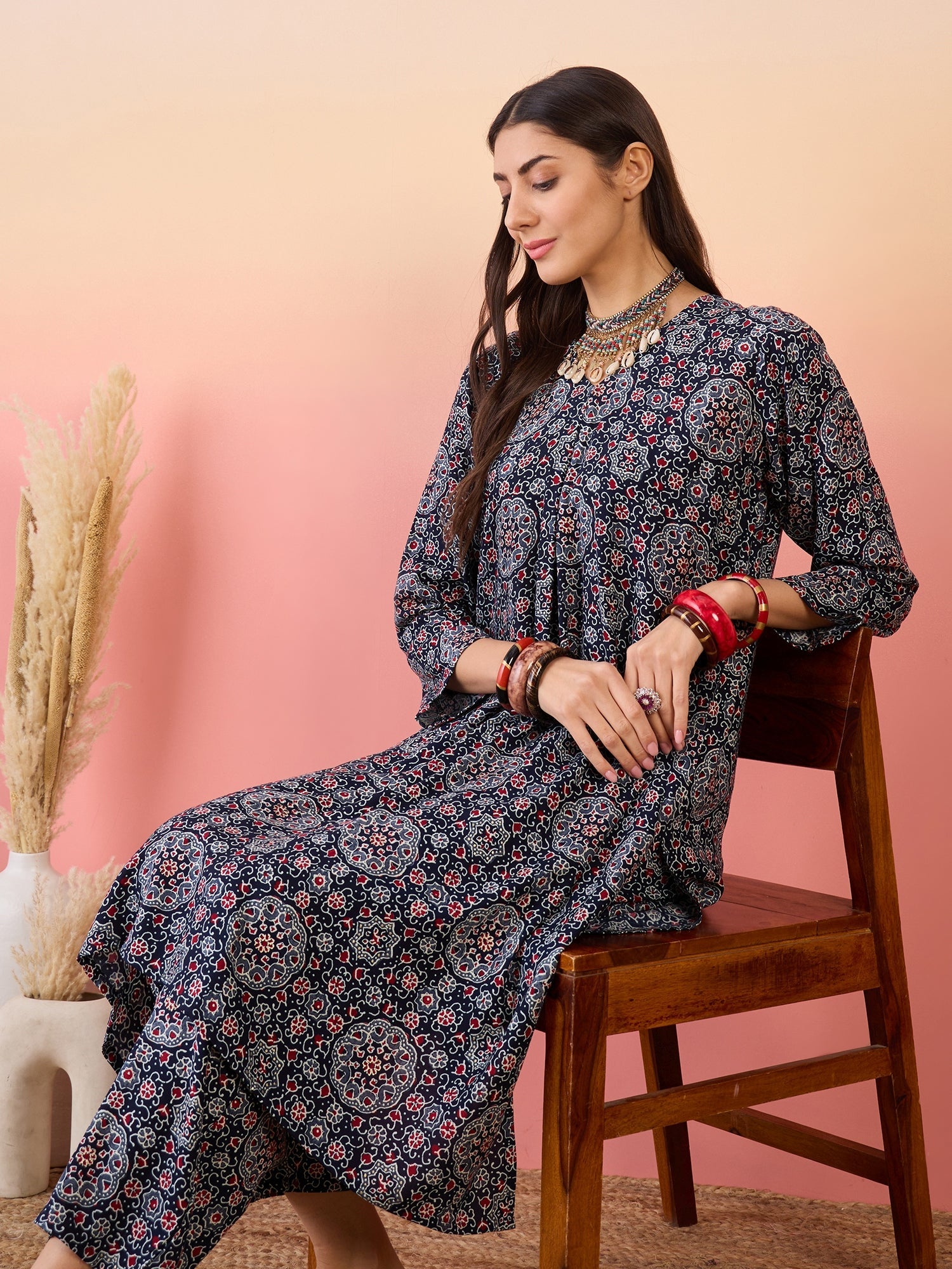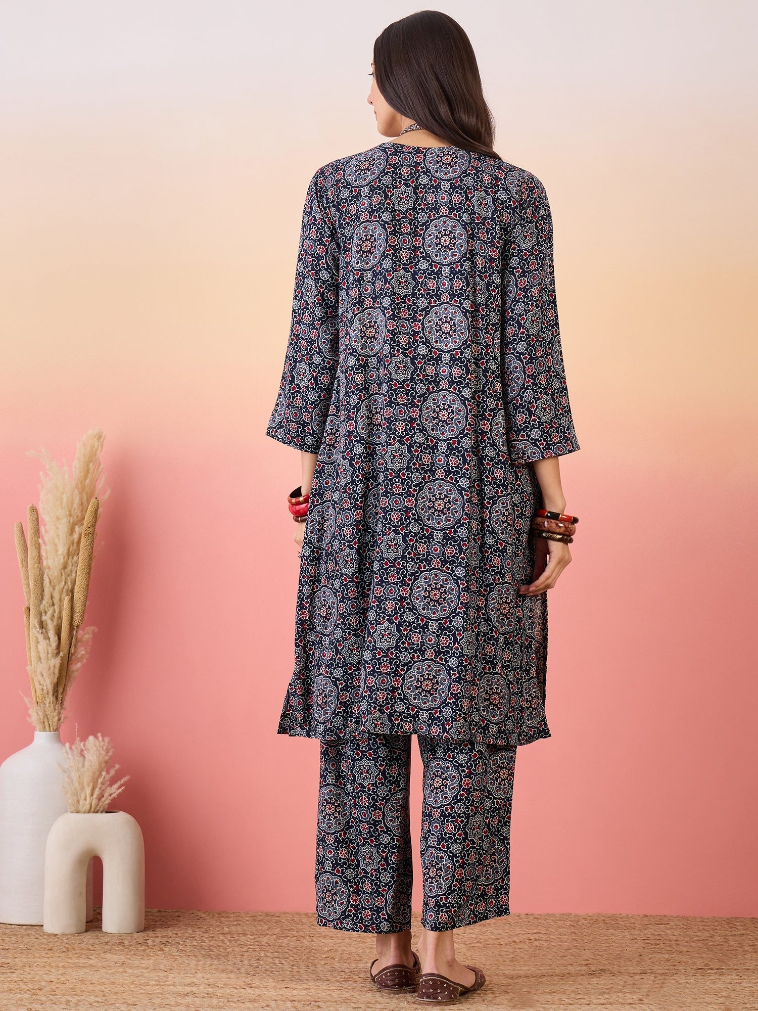 InWeave Navy Maroon Ajrakh Foil V Neck Kurta Pant Set