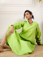 InWeave Neon Green Shawl Neck Long Side Pleat DressThe Set is crafted from best of Indian fabrics. Style it with Oxidised jewelery and juttis and y...