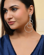 These silver-plated long drop earrings feature a stunning crescent shape, beautifully adorned with sparkling AD stones. The elegant design offers a perfect blend of modern sophistication and timeless charm. Ideal for weddings, parties, or special events, these earrings add a striking touch of glamour to any outfit, elevating your look with their graceful, eye-catching appeal.