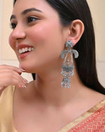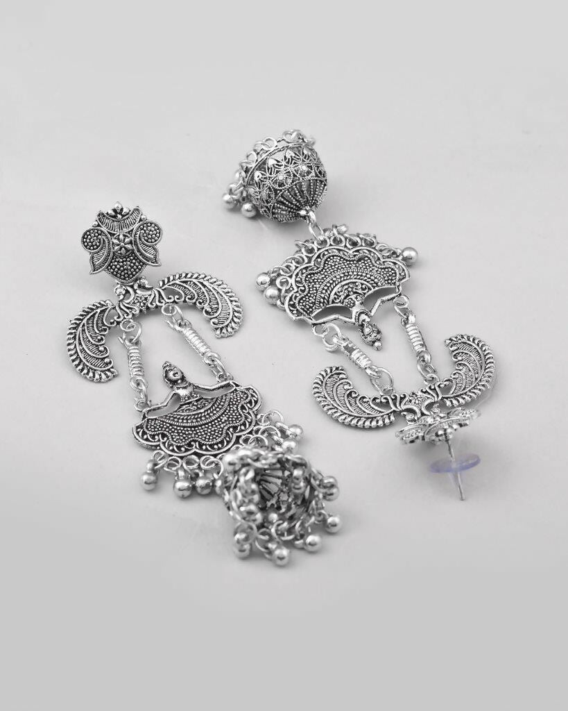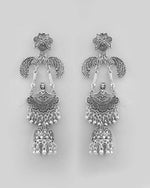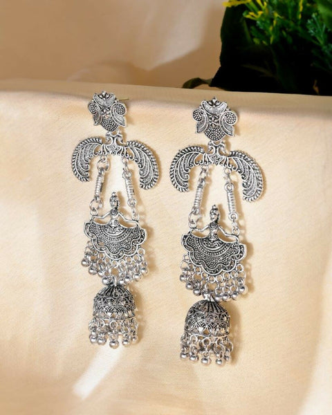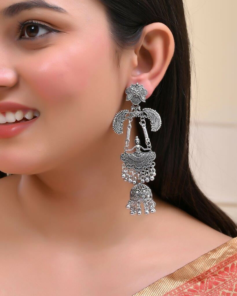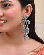 Enhance your style with our Silver Plated Oxidized Dancing Drop Earrings. Featuring a unique design that captures movement and grace, these earrings showcase intricate detailing and an eye-catching oxidized finish. Lightweight and comfortable, they are perfect for both casual outings and special occasions. Add a touch of elegance to any outfit with these stunning statement earrings!