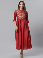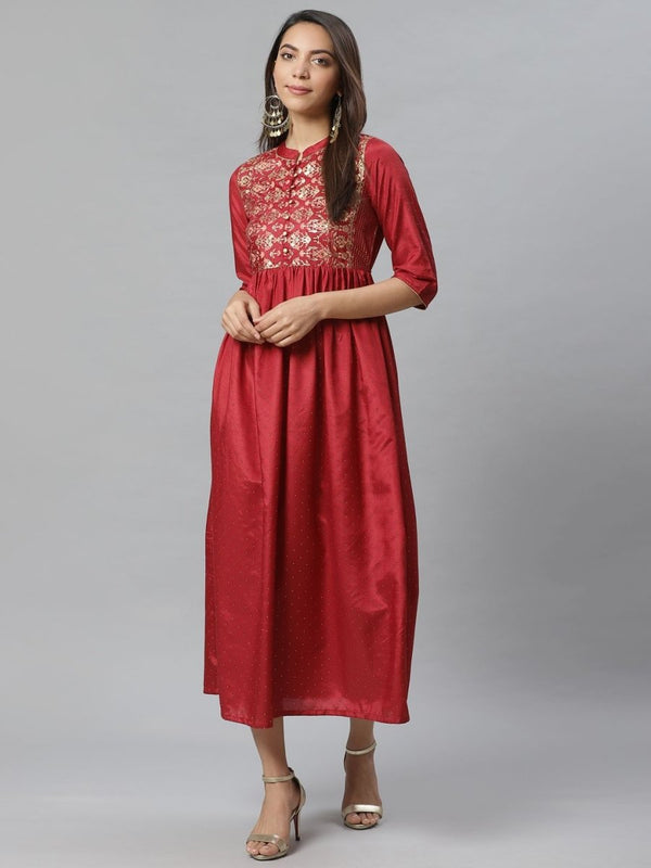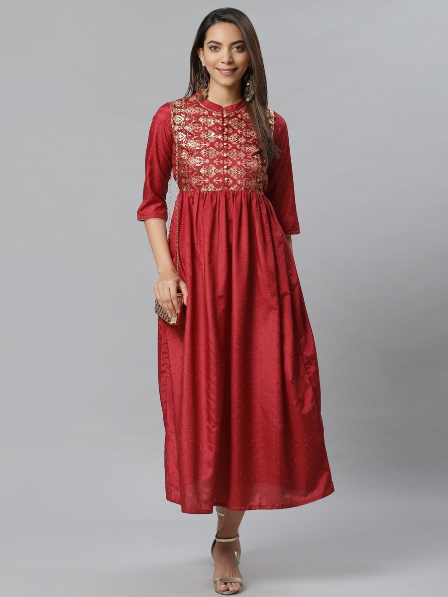AURELIA Women Maroon & Golden Embellished A-Line Dress - Distacart