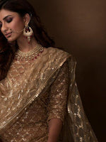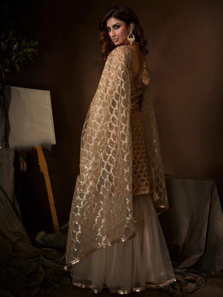 Beige Soft Net Gharara Suit features a soft net kameez,net dupatta. sequins and Dori embellishments are used for the embroidery of this style.