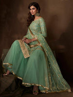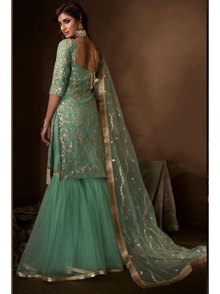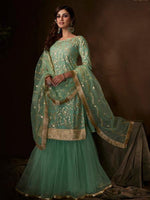 Green Soft Net Gharara Suit features a soft net kameez,net dupatta. sequins and zari are embellishments are used for the embroidery of this style.