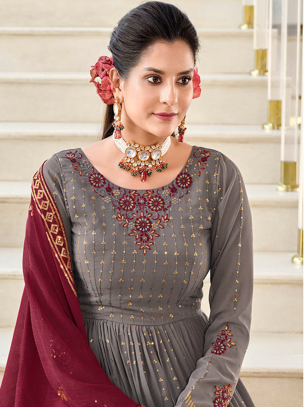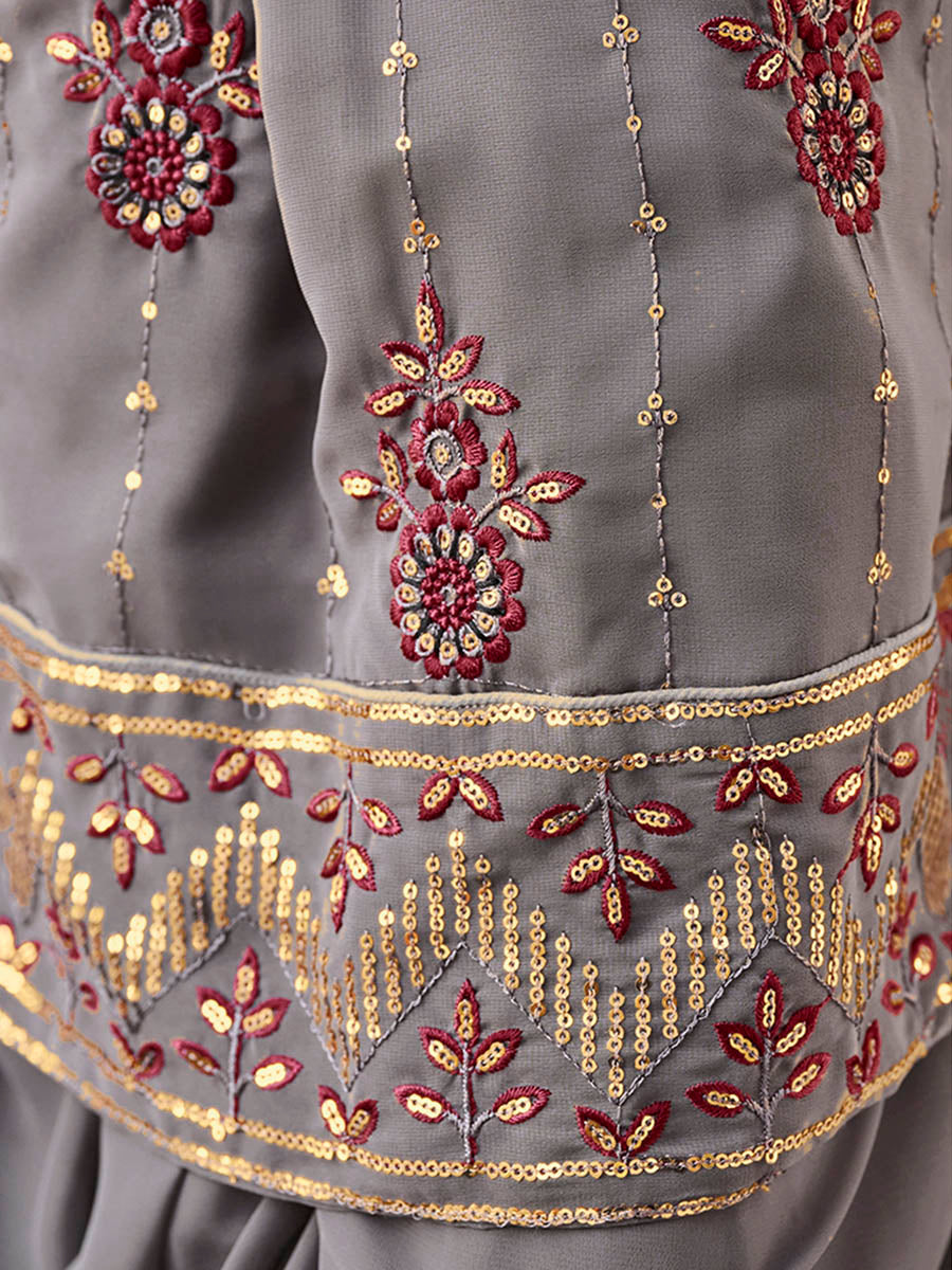 Grey and Wine Real Georgette Gharara Suit features a real georgette top and bottom with georgette dupatta.Embroidery is completed with thread and sequins. This Style is made in India and checked by hand to ensure high quality.