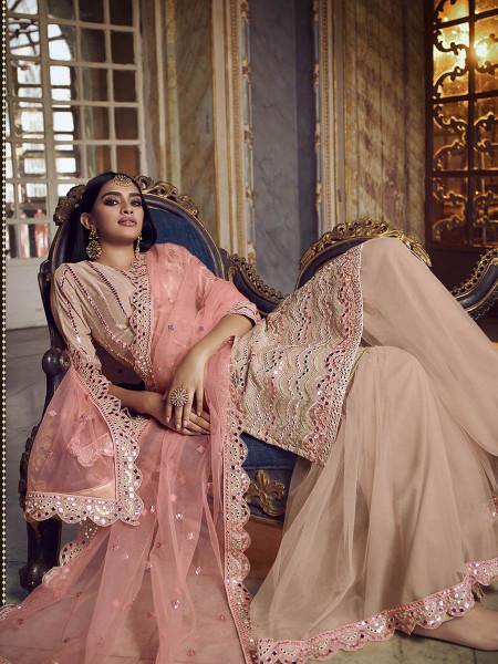 Peach Heavy Embroidered Gharara Suit features a Soft net kameez , Soft net bottom with Soft net dupatta. embroidery is completed with Thread and Foil Mirror. this Style is made in India and checked by hand to ensure high quality.