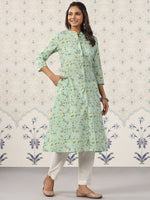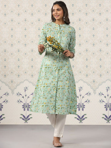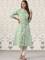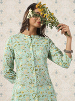 Ode by House of Pataudi Floral Printed Band Collar Pure Cotton Kurta Product Details Colour: green Floral printed Band collar Three-quarter, r...