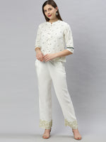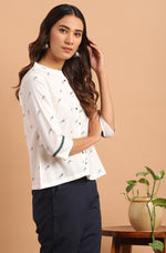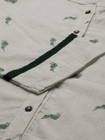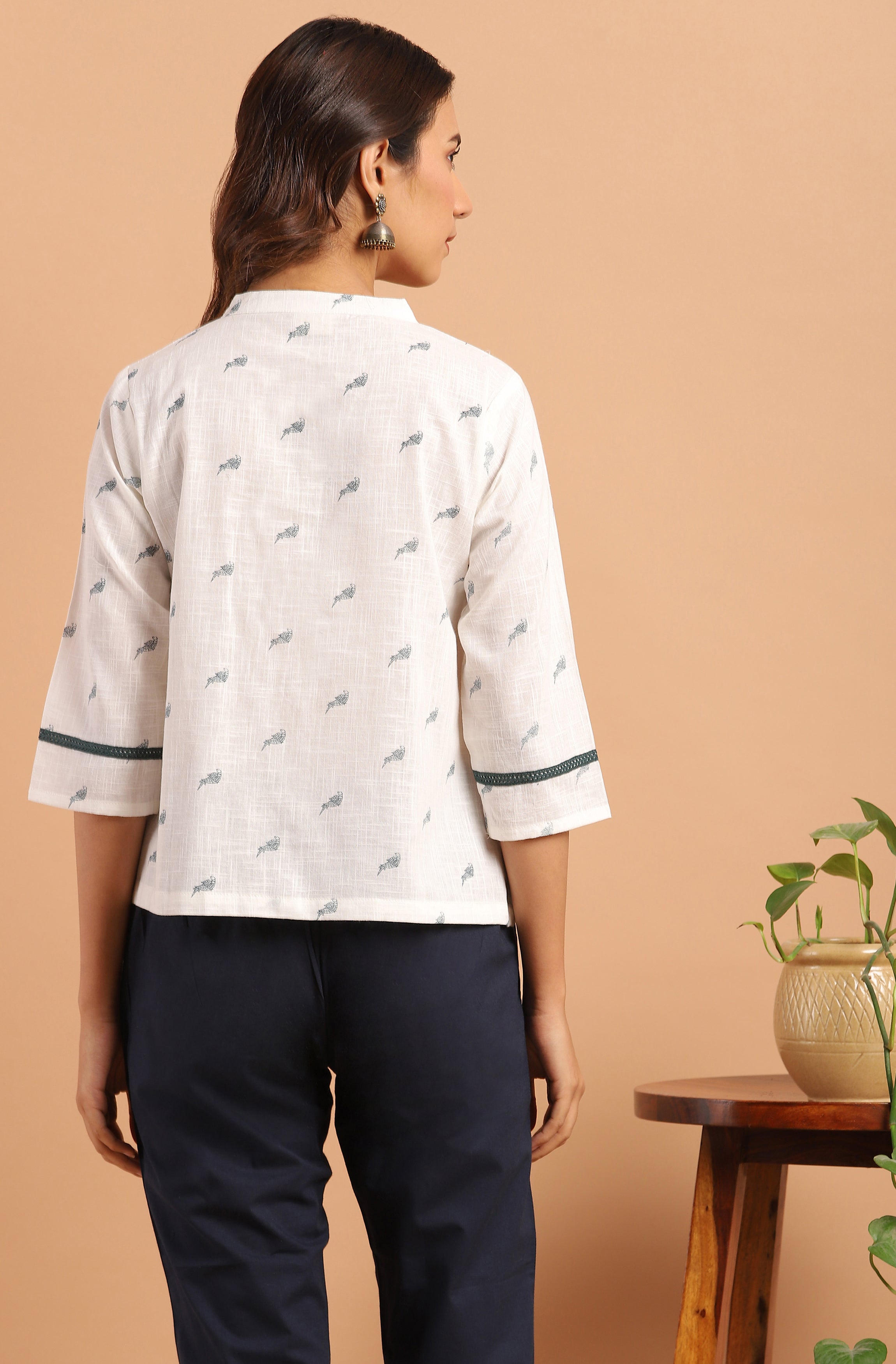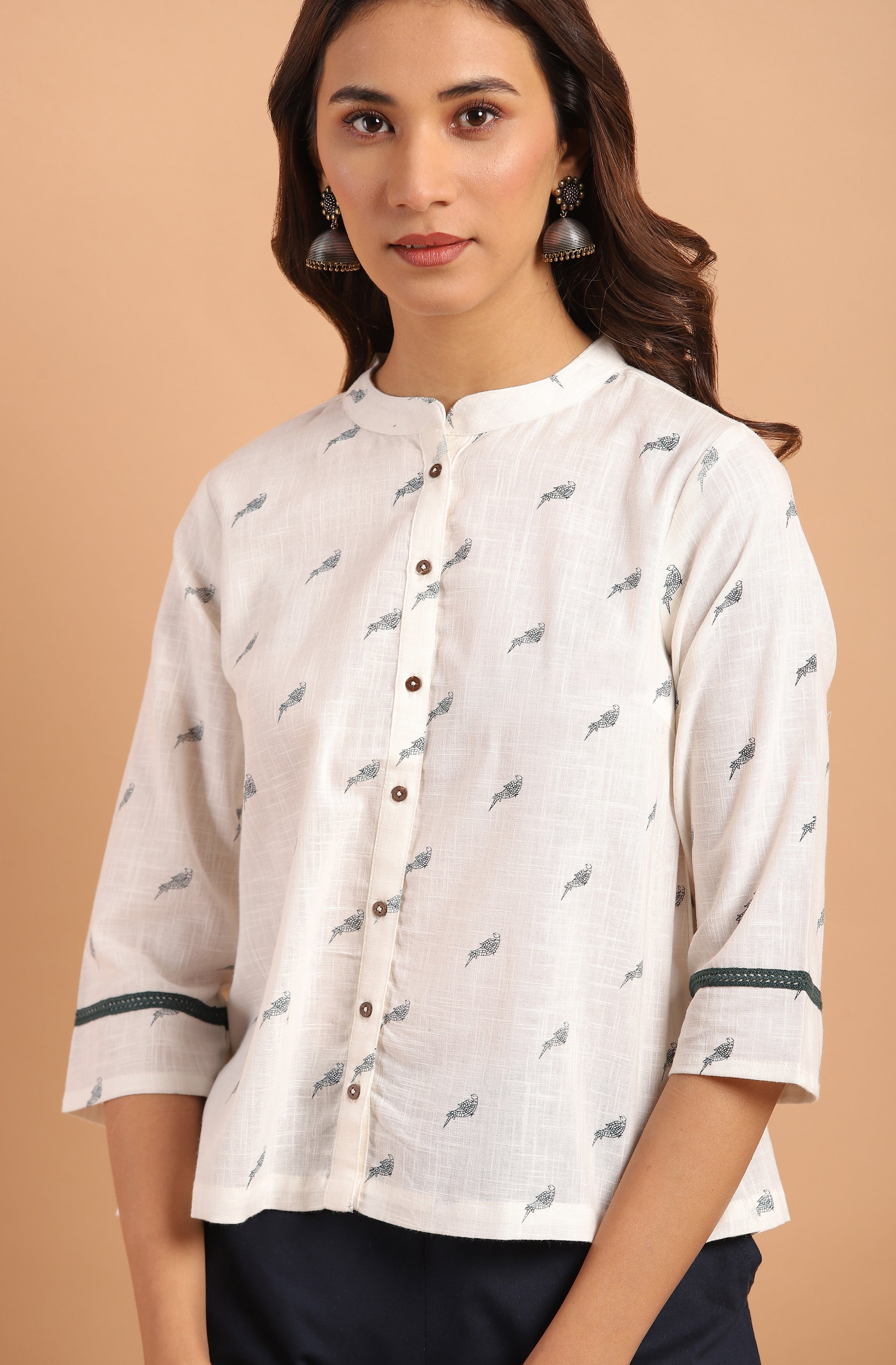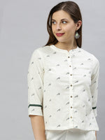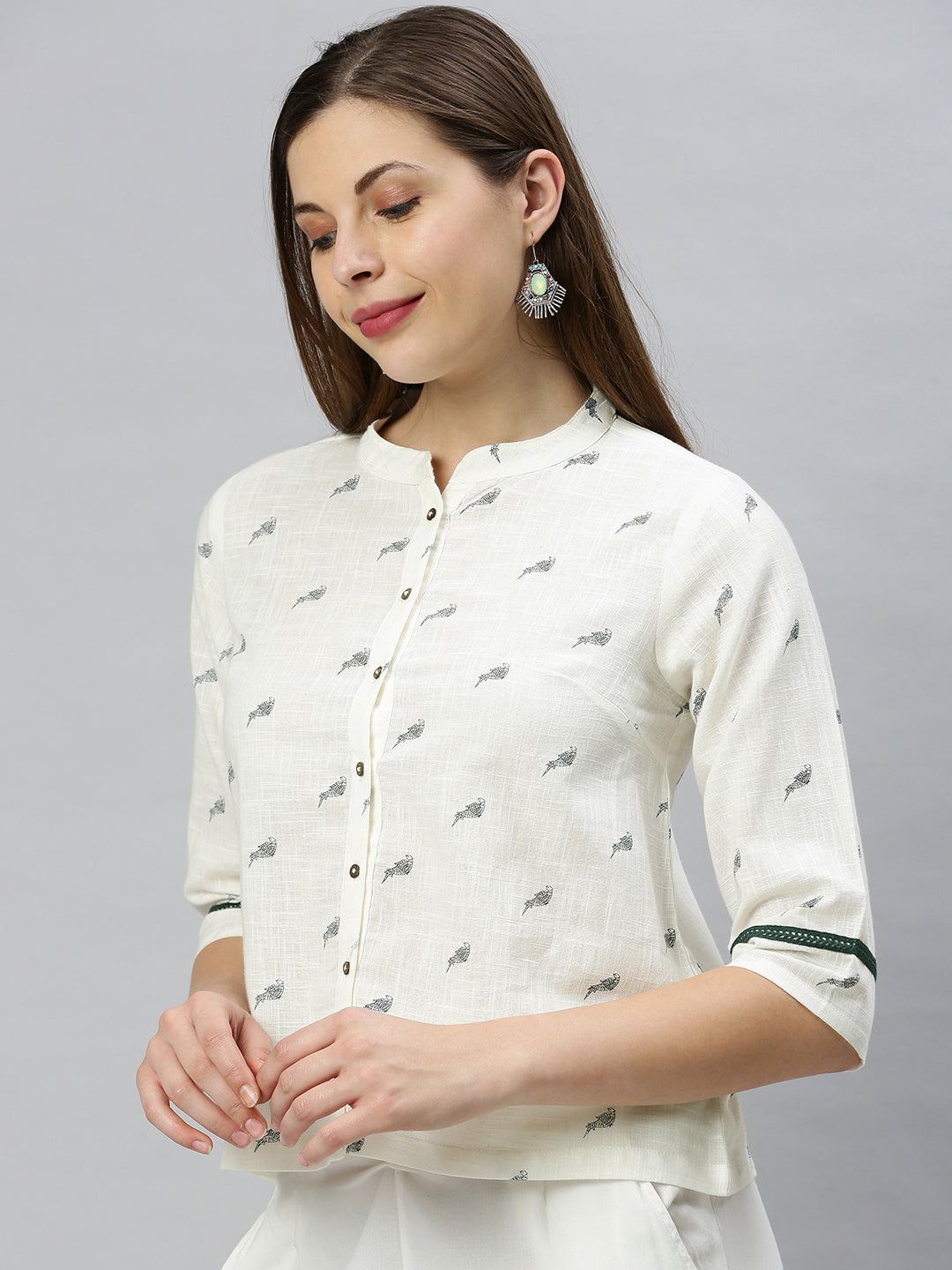 For year-round comfort and style, go with this three-quarter sleeve top from Janasya. Made from cotton slub, this piece has bird motif print all-over, mandarin neck and button placket. Style this off-white shirt style piece with distressed denims and trainers when you have errands to run.