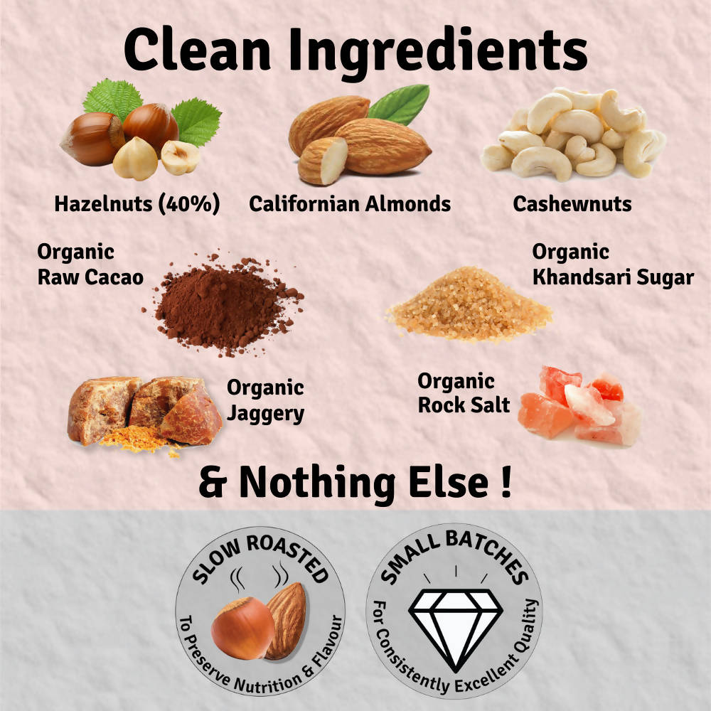 • This delicious and nutritious Crunchy Hazelnut Spread (with 17% Protein) is a unique blend of Premium Hazelnuts, Almonds, Cashewnuts, Organic Raw Cacao Powder (super-rich in anti-oxidants), Organic Raw Sugar and Organic Rock Salt.