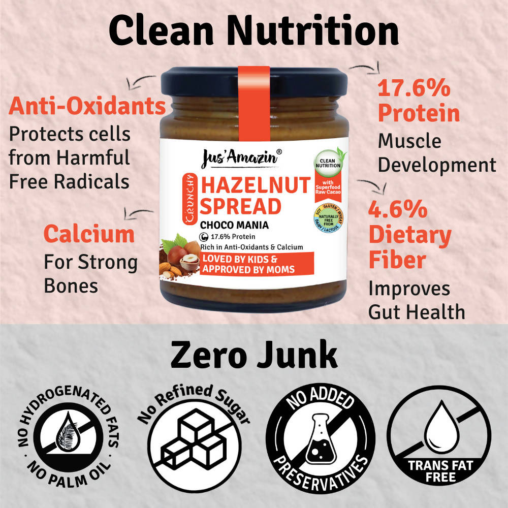Jus Amazin Hazelnut Spread Crunchy - Choco Mania This delicious and nutritious Crunchy Hazelnut Spread (with 17% Protein) is a unique blend of Prem...