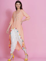This embroidered peach rayon assymetrical kurta with tulip pants is by Women Republic.It had beutifull embroidery and tasseles and is crefted in rayon