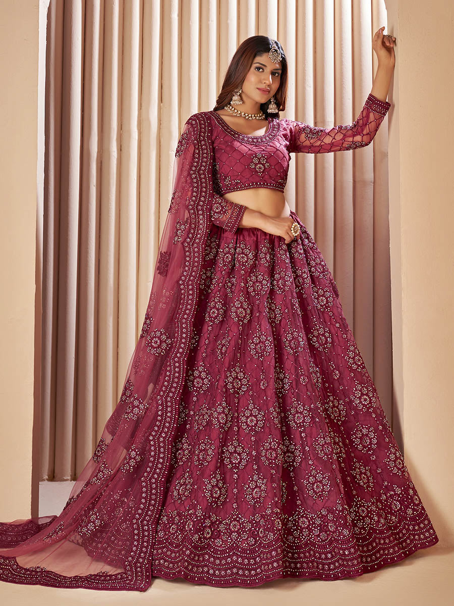 Lilac Heavy Embroidered Designer Lehenga features a net with silk blouse and lehenga with net dupatta. Embroidery is completed with thread and dori work. This Style is made in India and checked by hand to ensure high quality.