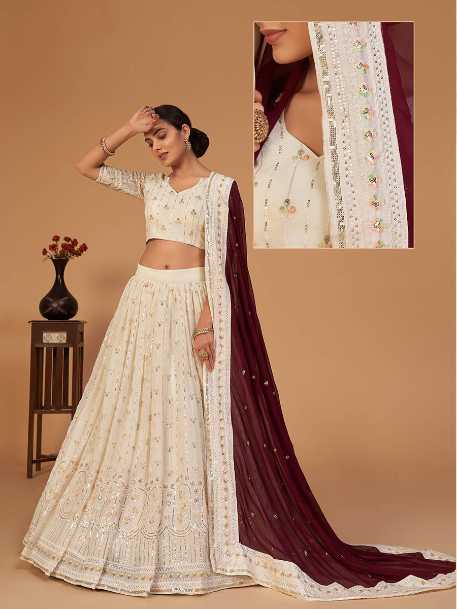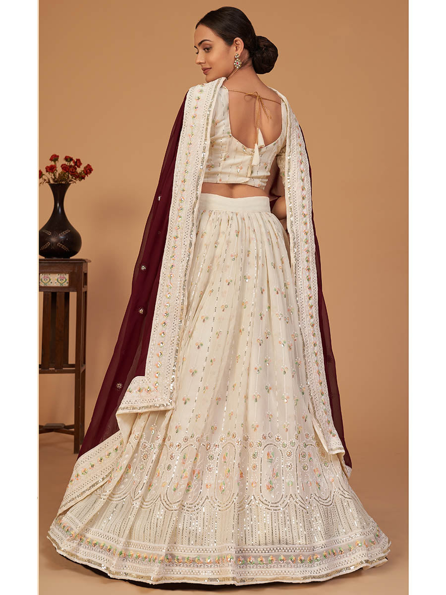 Off White Georgette Embroidered Designer Lehenga features a georgette lehenga and georgette choli with art silk inner. Embroidery is completed with thread and sequins work. This Style is made in India and checked by hand to ensure high quality.