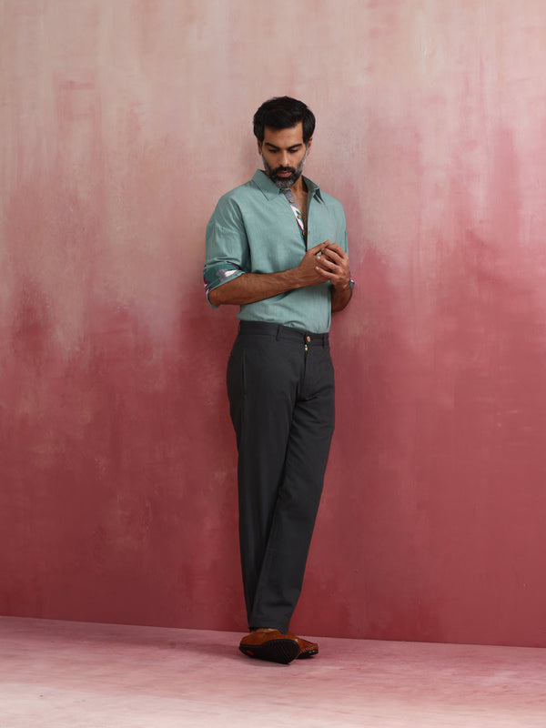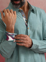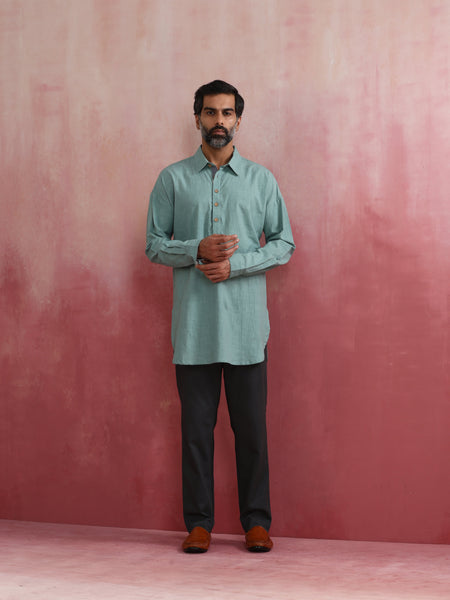Upgrade your festive wardrobe with this elegant aqua blue cotton kurta, featuring a classic shirt collar, mid-thigh length and full sleeves.