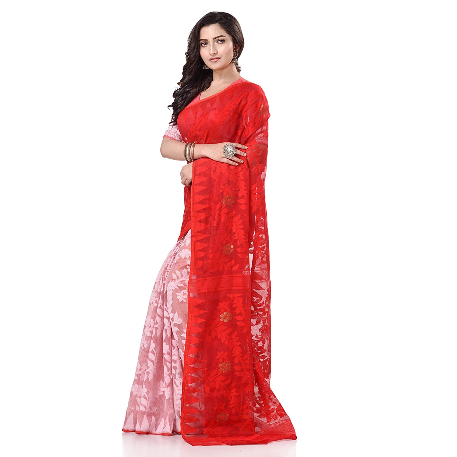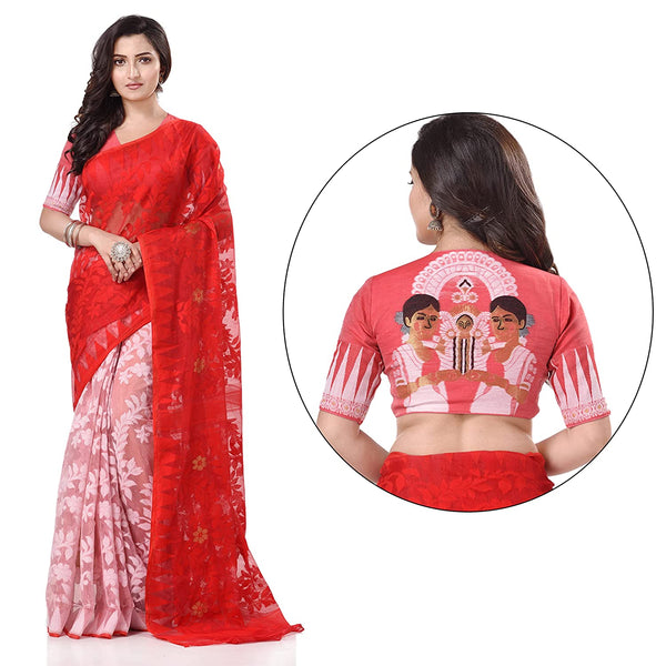 Desh Bidesh Women's Tant Handloom Soft Dhakai Jamdani Cotton Saree Whole Body Design Saree Color: Red::White Saree Fabric: Pure Cotton Saree Len...