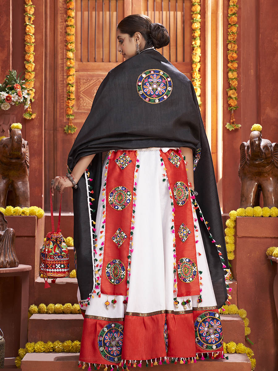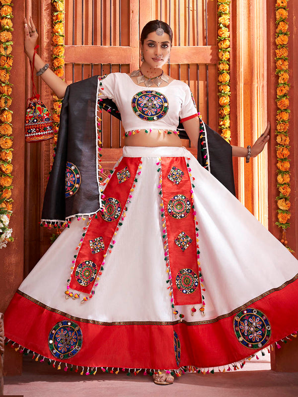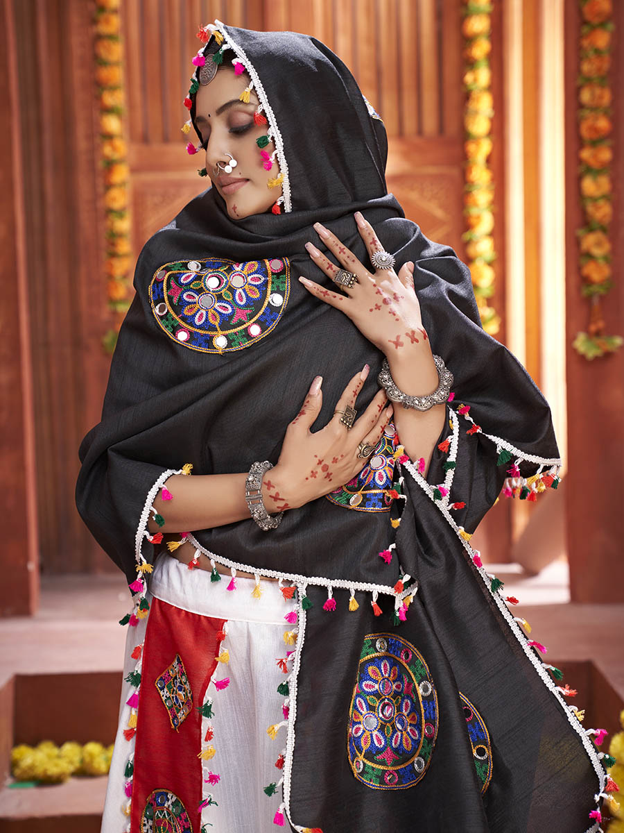 White Art Silk Gamthi Work Designer Lehenga features a art silk blouse with art silk lehenga and dupatta. Embroidery have gamthi work with real mirror work and patch work. This Style is made in India and checked by hand to ensure high quality.