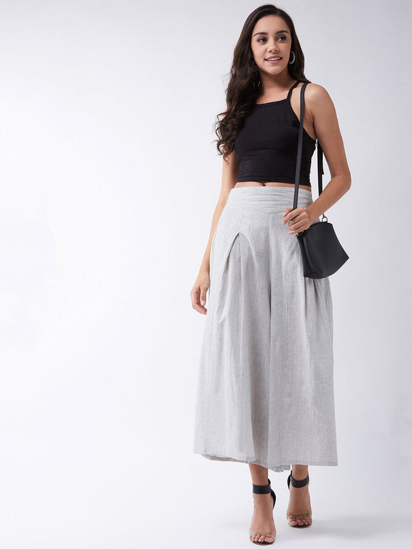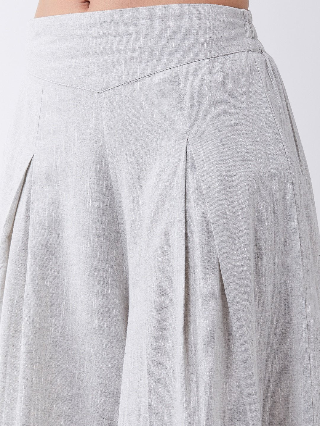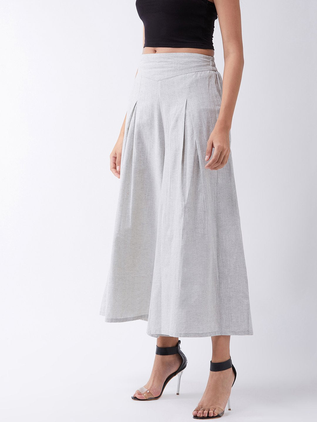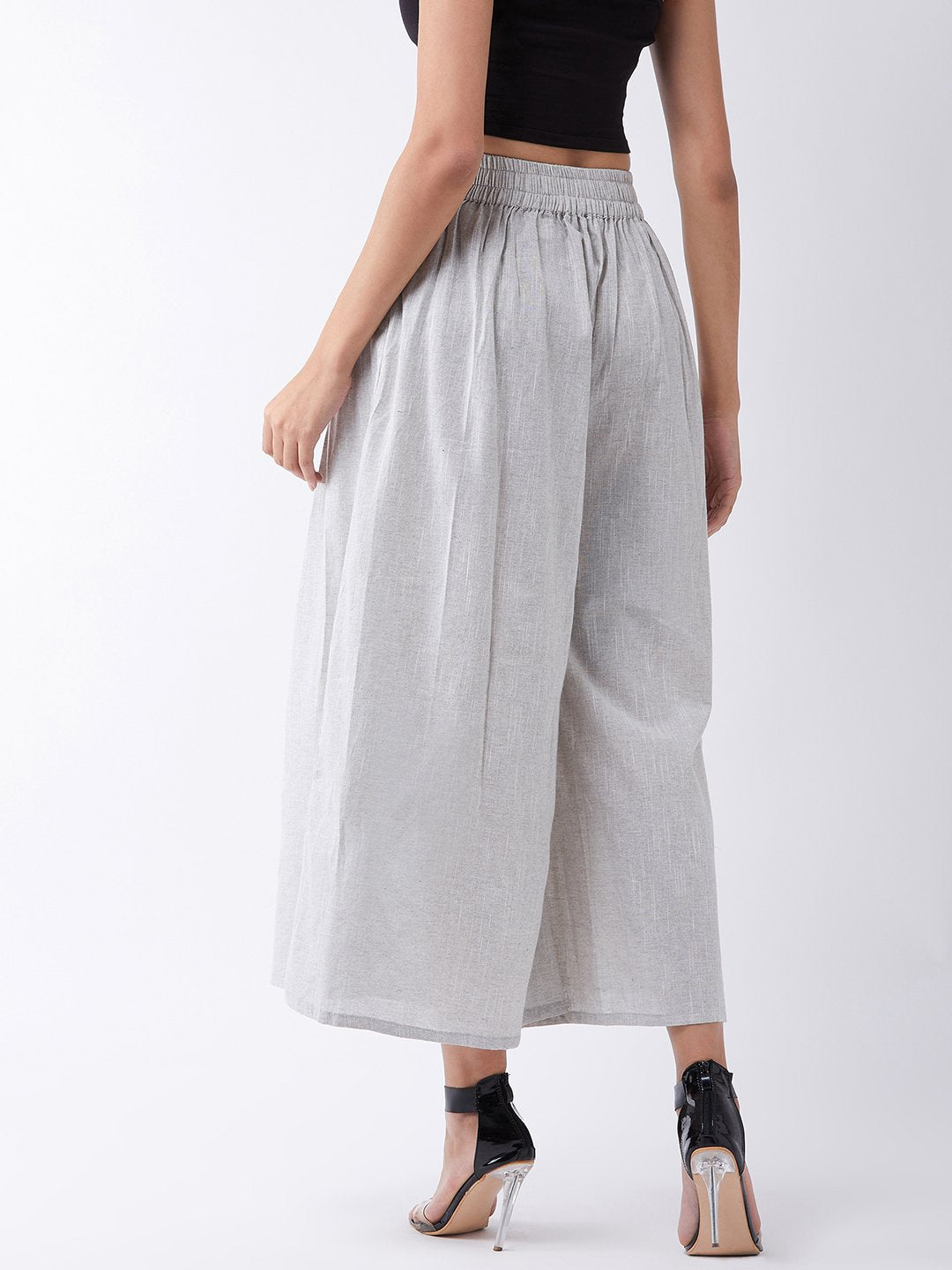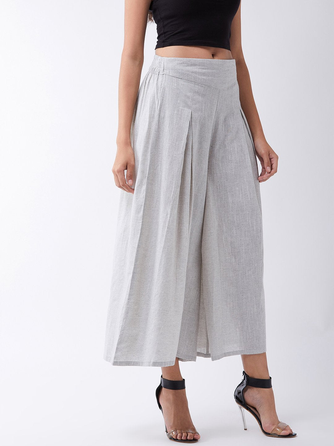 Embrace the spirit of summer with this pair of cool gray coloured handloom palazzos. These cropped palazzos are made with original cotton fabric and showcase pretty front pleats.