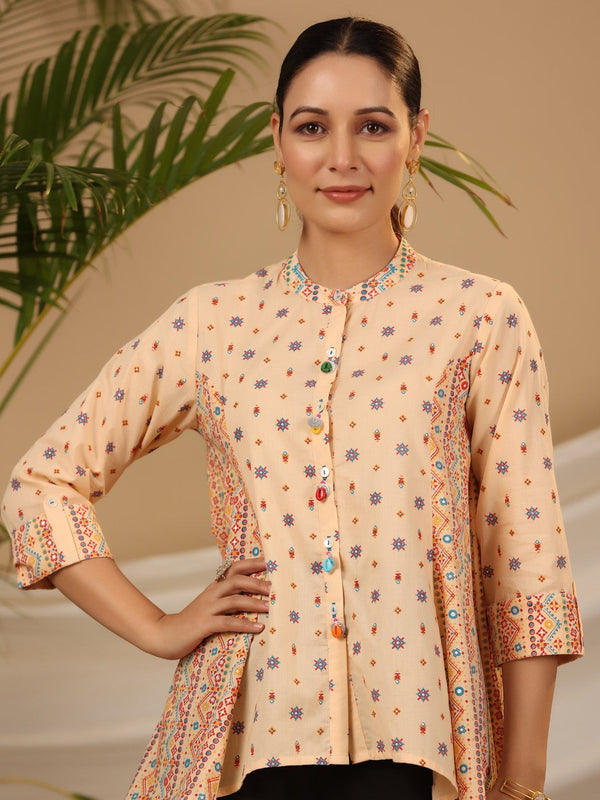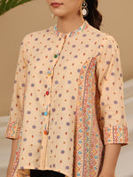 The Banjara Peach Pure Cotton shirt featuring intricate prints and a flattering flared silhouette. Panelled with curved hemline, above-knee length, and adorned with a mandarin collar, button, and delicate beadwork.
