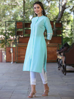 Seagreen cotton slub straight kurta with front open button closure and three fourth sleeve with lace insert and zari embroidery