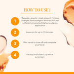 Step 1: Massage onto clean, damp skin using a circular motion. The formula changes from orange to white to indicate sufficient physical exfoliation and even application. Leave it on for up to 10 minutes.