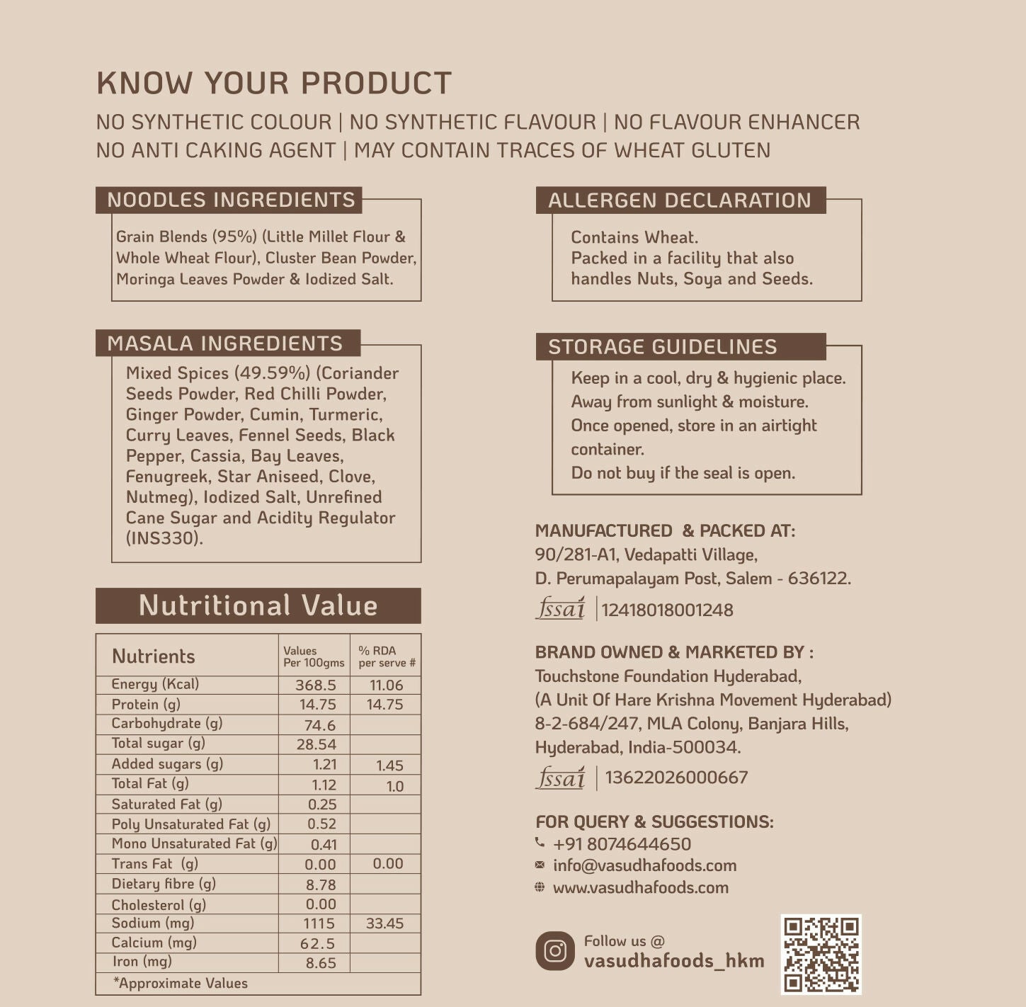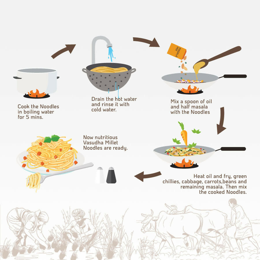• But that's not all – our noodles are paired with a satvik masala, free from MSG, ensuring a pure and authentic flavor profile that aligns with your health-conscious choices. Delight your taste buds with the perfect harmony of natural ingredients, while enjoying the nutritional richness of little millet.
