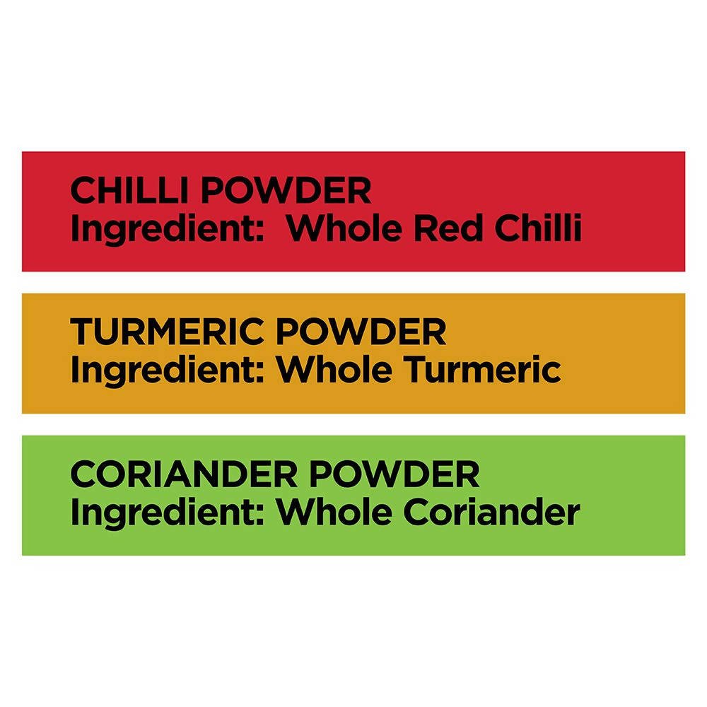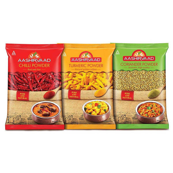 Aashirvaad Triple Spice PackThis pack contains: Aashirvaad Chilli Powder(200 gm) Aashirvad Turmeric Powder(200 gm) Aashirvad Coriander Powder(200 g...