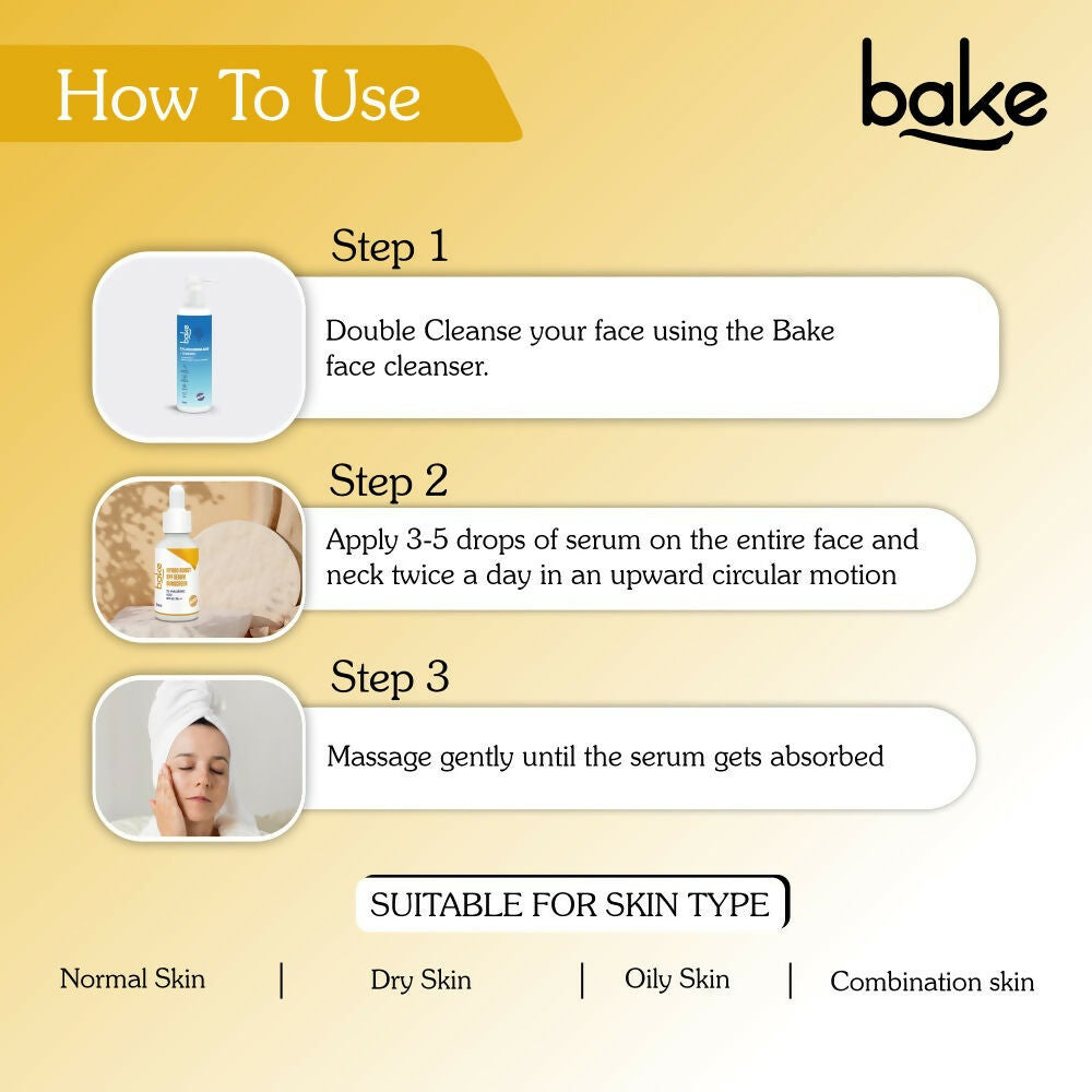 • Double cleanse your face using suitable Bake face cleanser. Apply 3-5 drops of serum on entire face and neck twice a day in an upward circular motion. Massage gently until the serum gets absorbed.