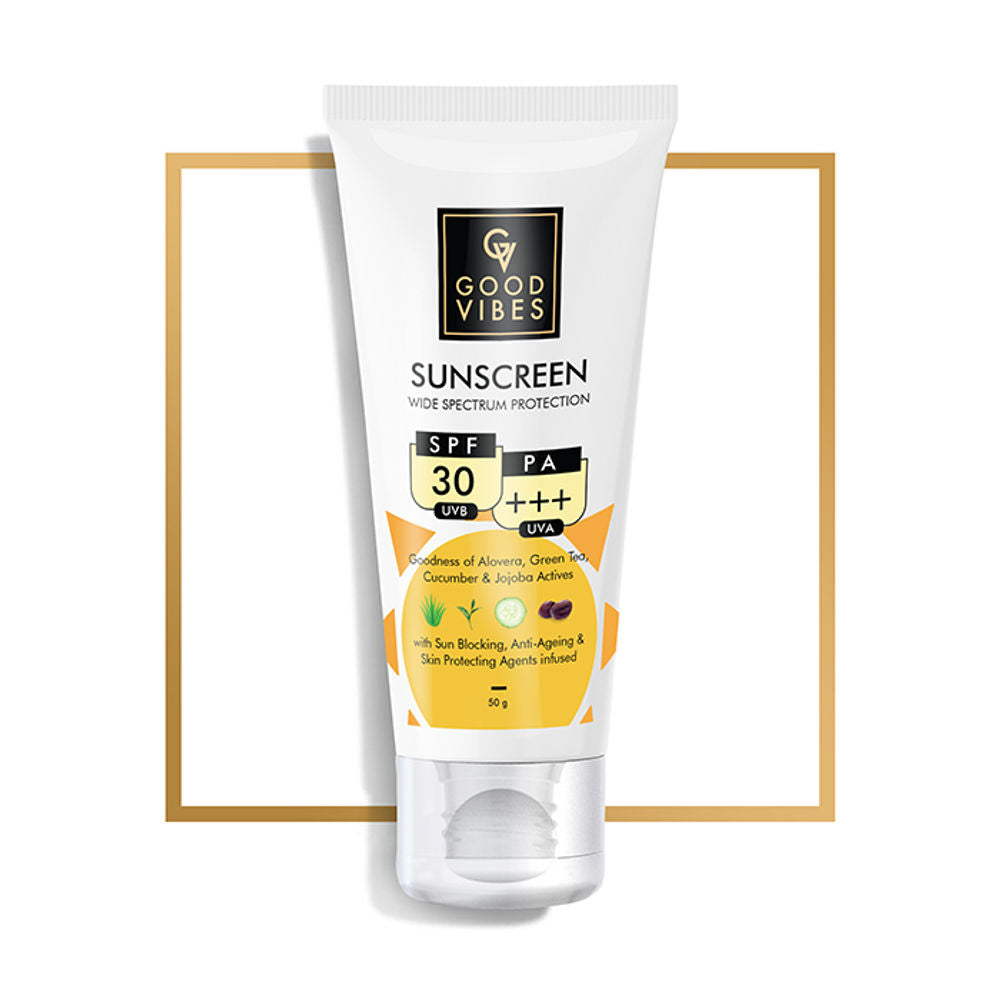 As you move outdoors or are even radiating your shine sitting inside a room protect your skin from the harmful UVA & UVB rays with Good Vibes Wide Spectrum Sunscreen with SPF 30. It helps you protect your skin from damage and dark spots. It doesn't leave a white cast on your skin and is powered with the natural goodness of Aloe Vera, Green Tea, Cucumber and Jojoba which makes sure to hydrate and nourish your skin while protecting it.