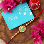 • We present you this elegant rakhi designed with beige colored beads with a green enameled dial.