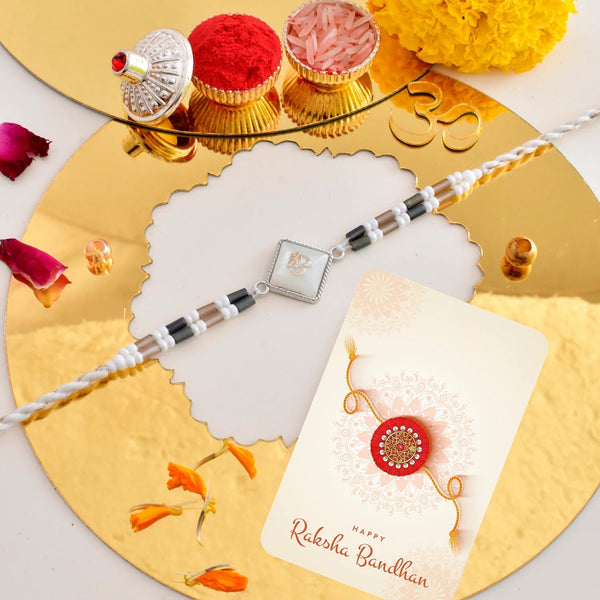 • Add a touch of divine love to your Raksha Bandhan celebration with this beautiful OM rakhi. Beaded and bejewelled, the rakhi is perfect for everyday, all day wear.