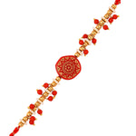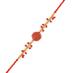 • Red enamelled traditional design thread rakhi, designed to add sparkle to the special day of Raksha Bandhan. Embellished with white pearls and perfect for all day wear.