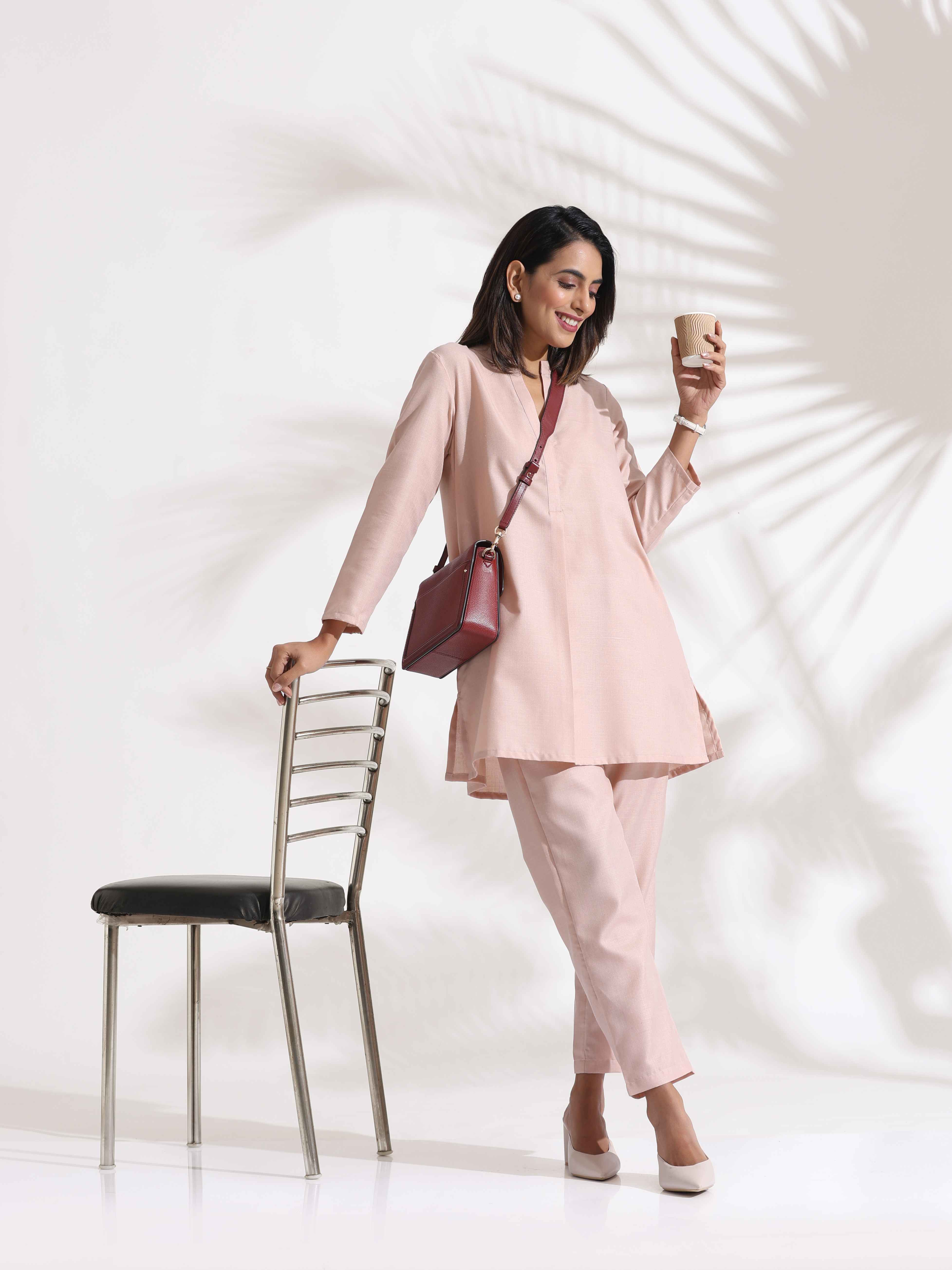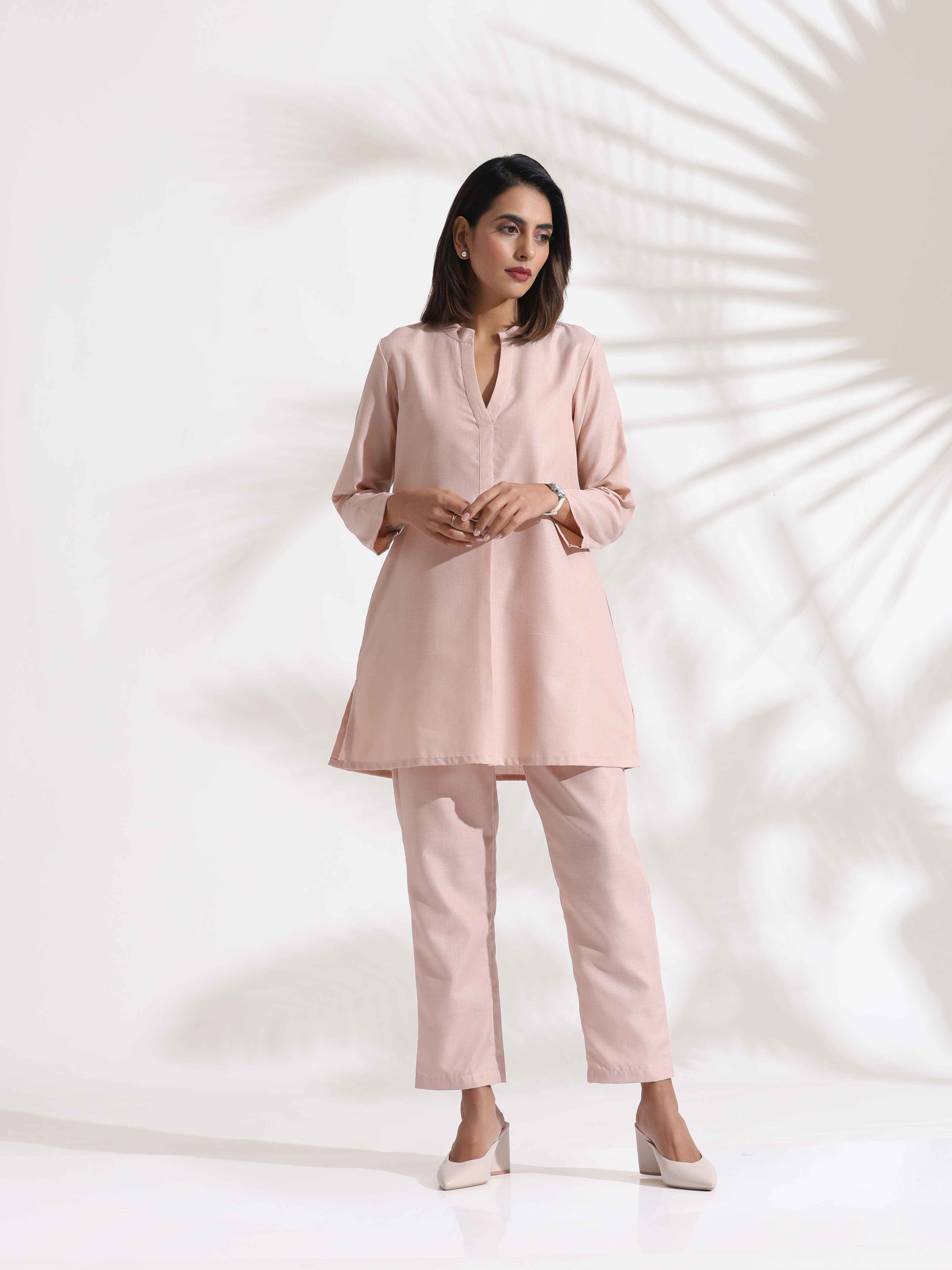 • Elevate your style with this light pink straight fit top with light pink pants, it's an ideal blend of elegance and comfort.