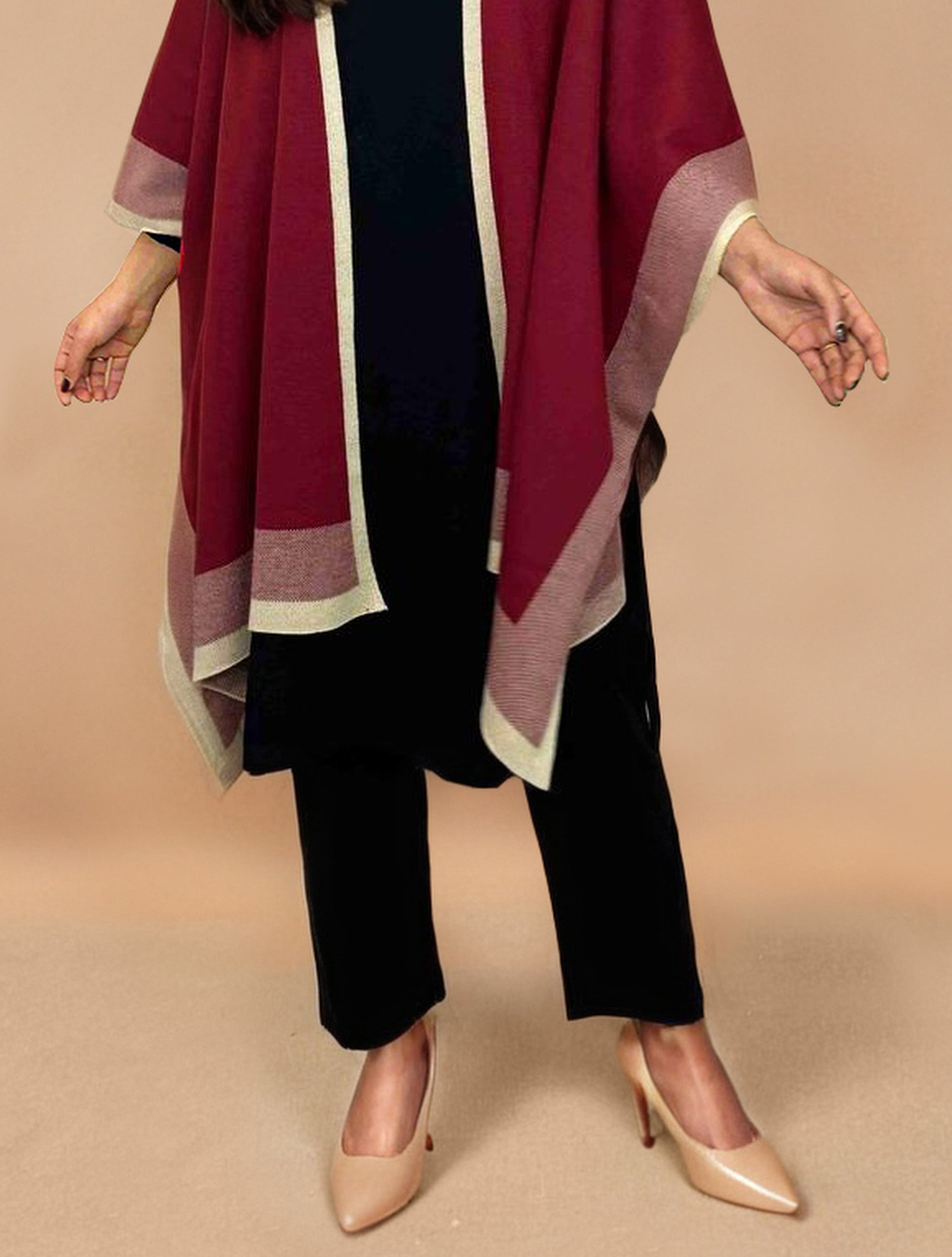 • Elevate your style with this maroon woollen kaftan cape, it's an ideal blend of elegance and comfort.
