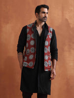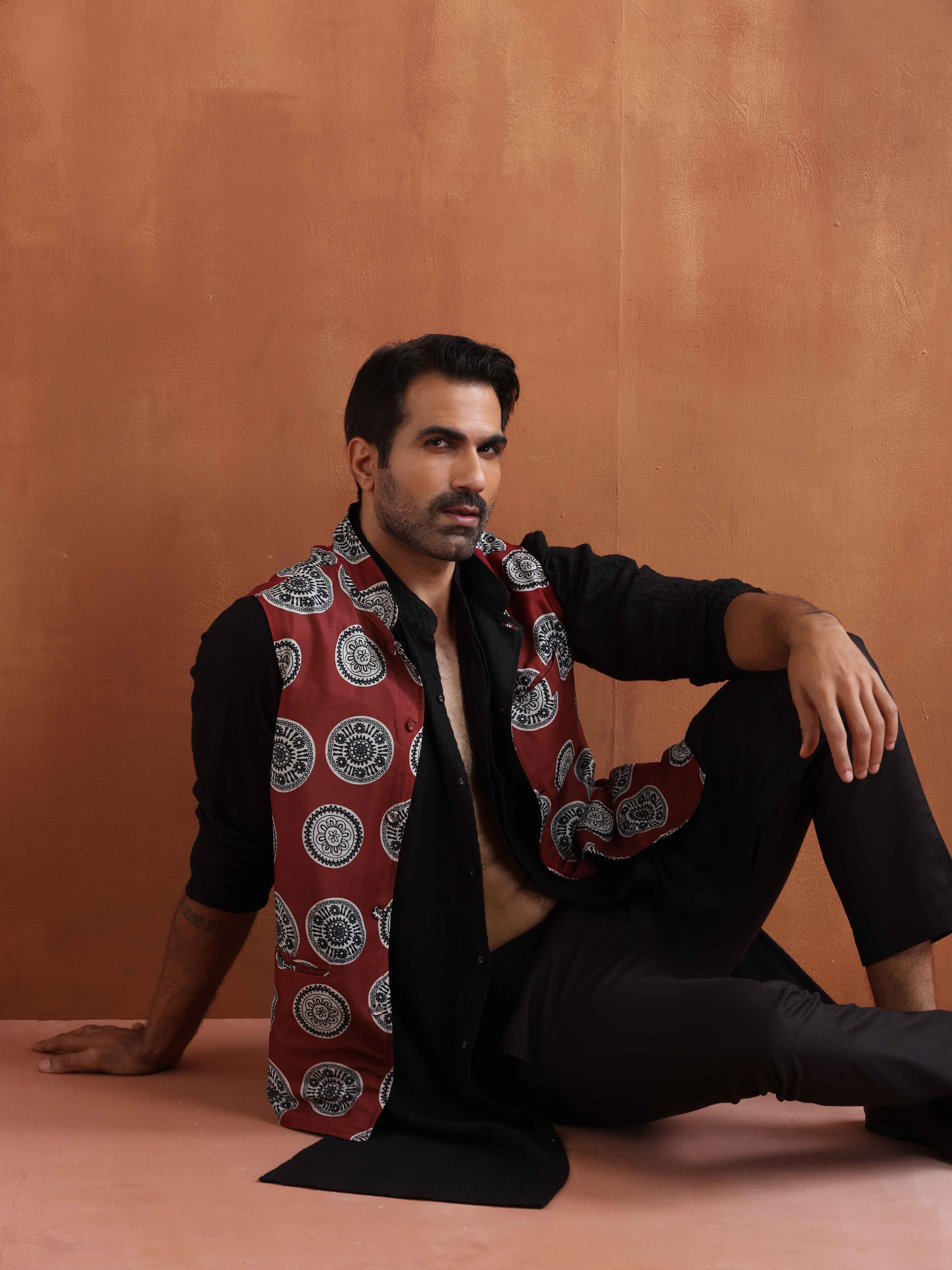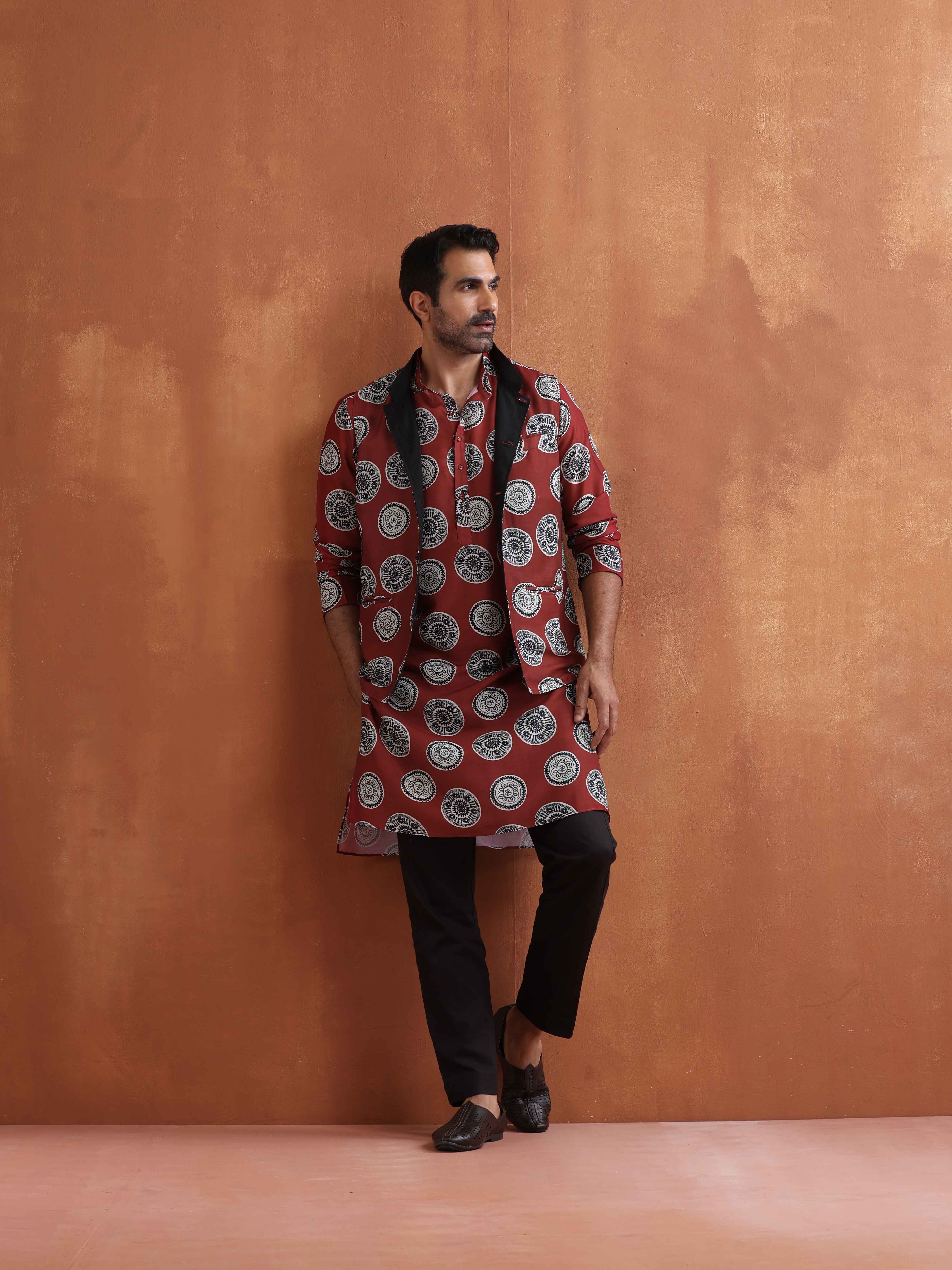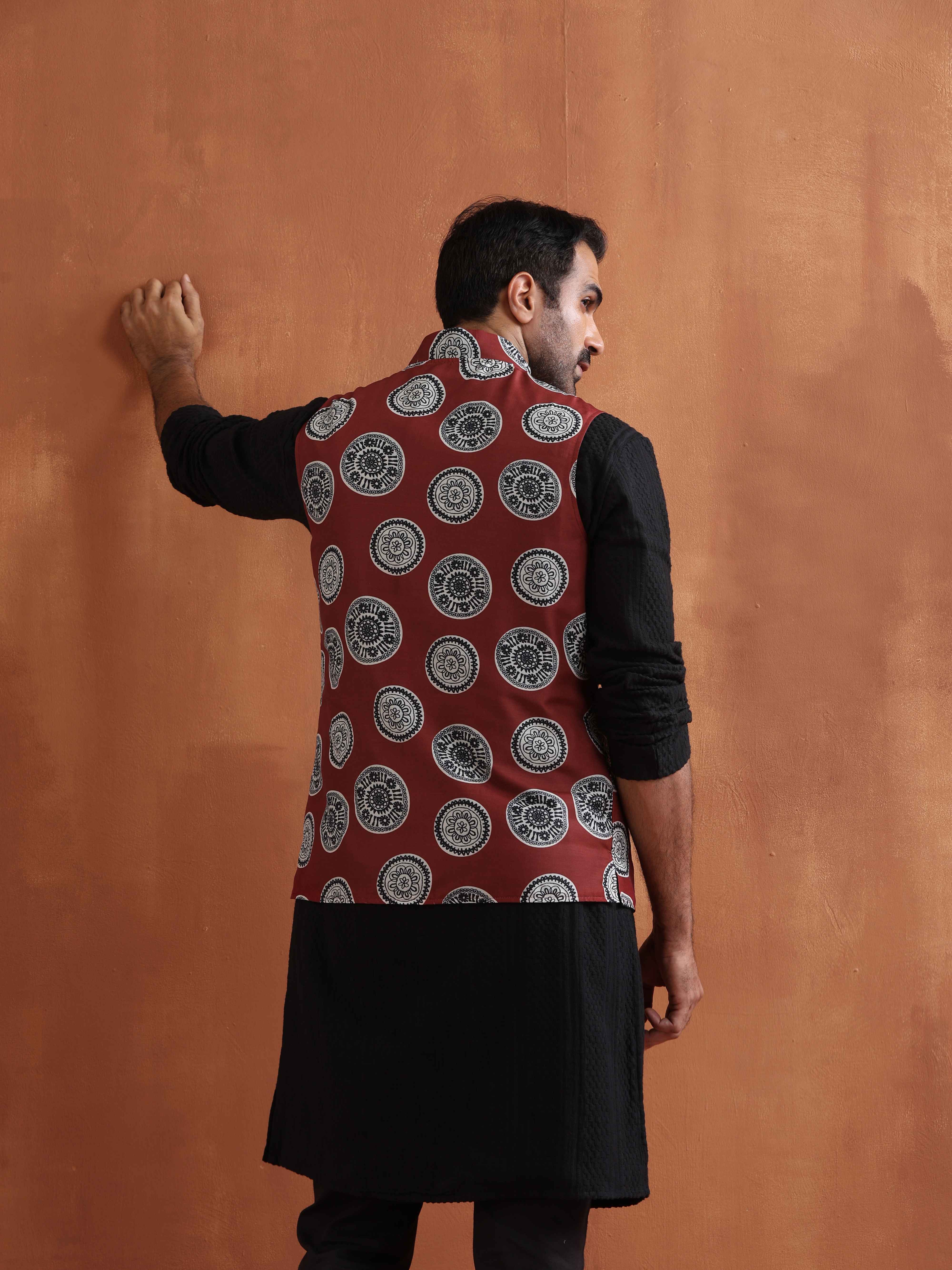 • Upgrade your festive wardrobe with this rust printed nehru jacket.
