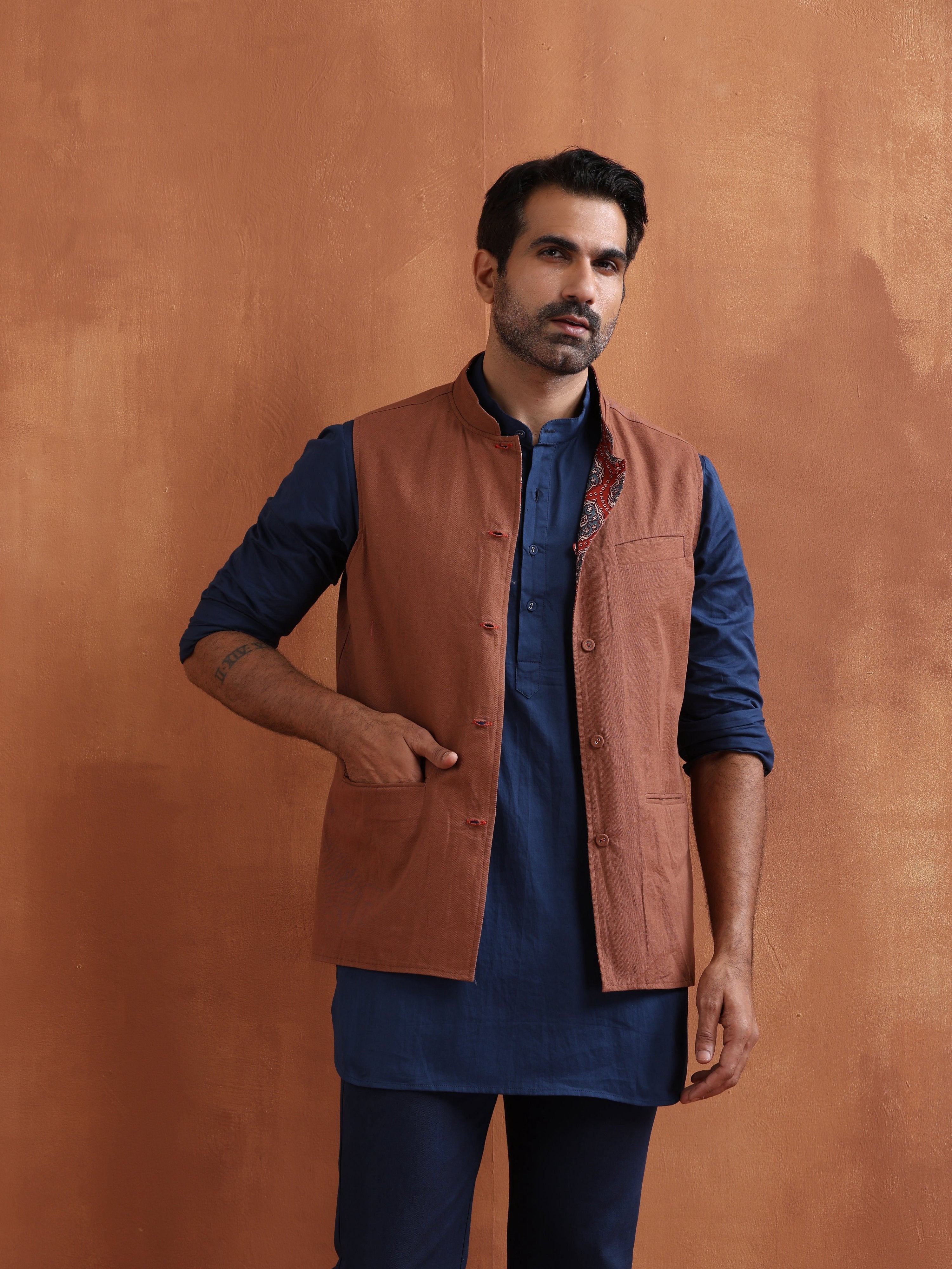trueBrowns Men's Rust Printed Reversible Nehru Jacket