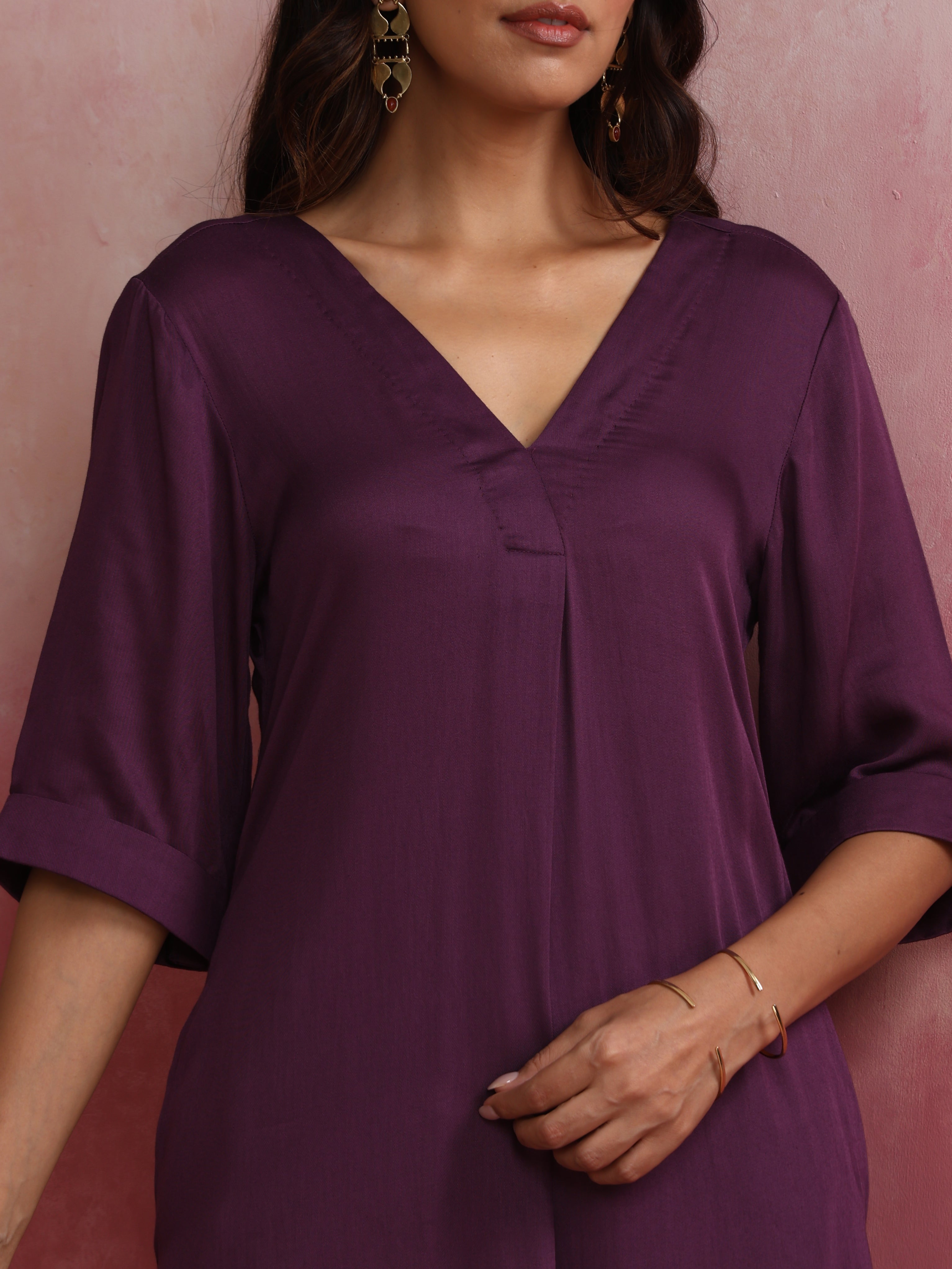 • Elevate your style with this purple modal straight kurta featuring back deep v neckline and elbow sleeves.