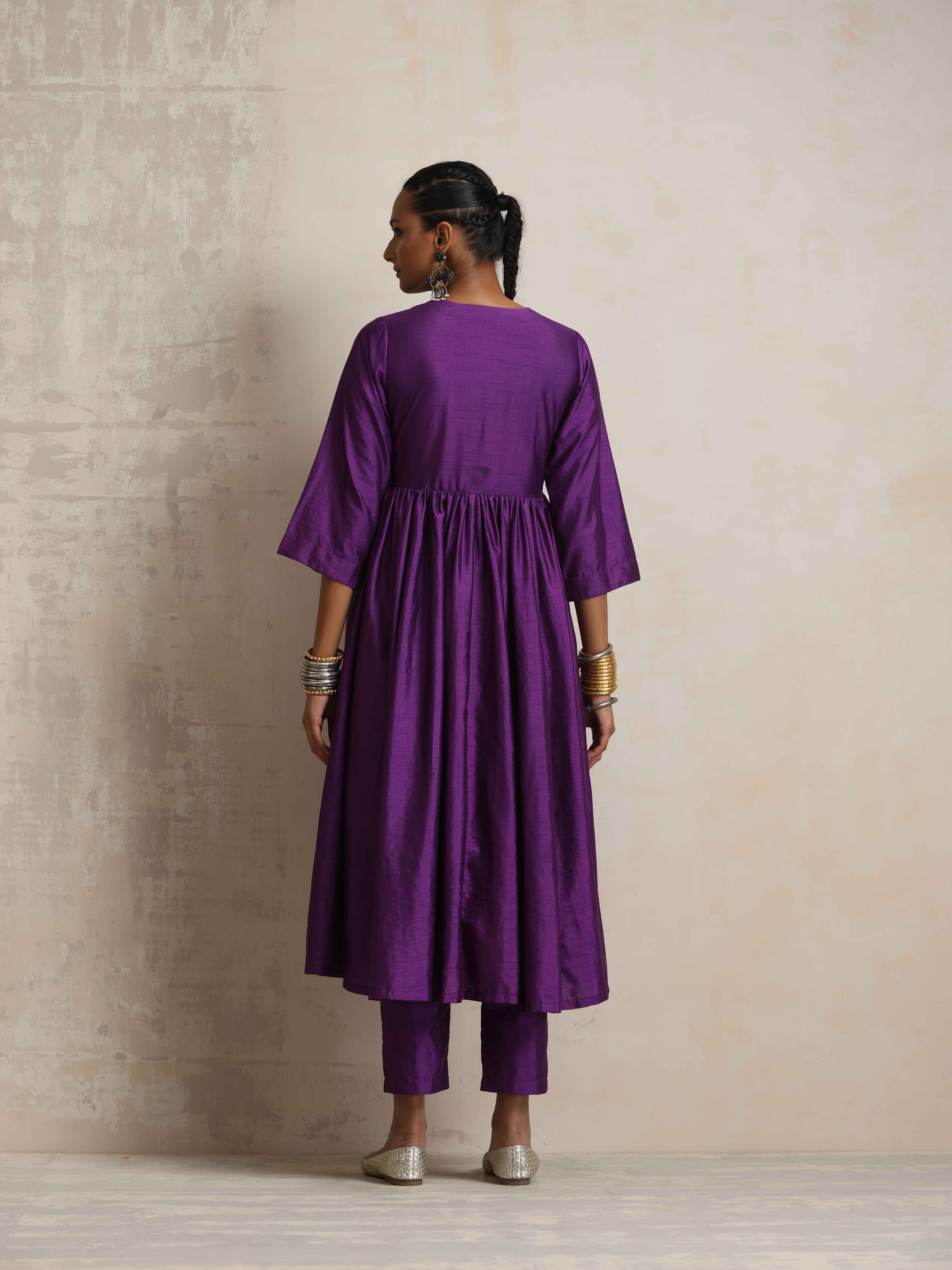trueBrowns Purple Silk Anarkali Flared Kurta SetDescription Elevate your style with this purple silk blend flared kurta paired perfectly with purpl...