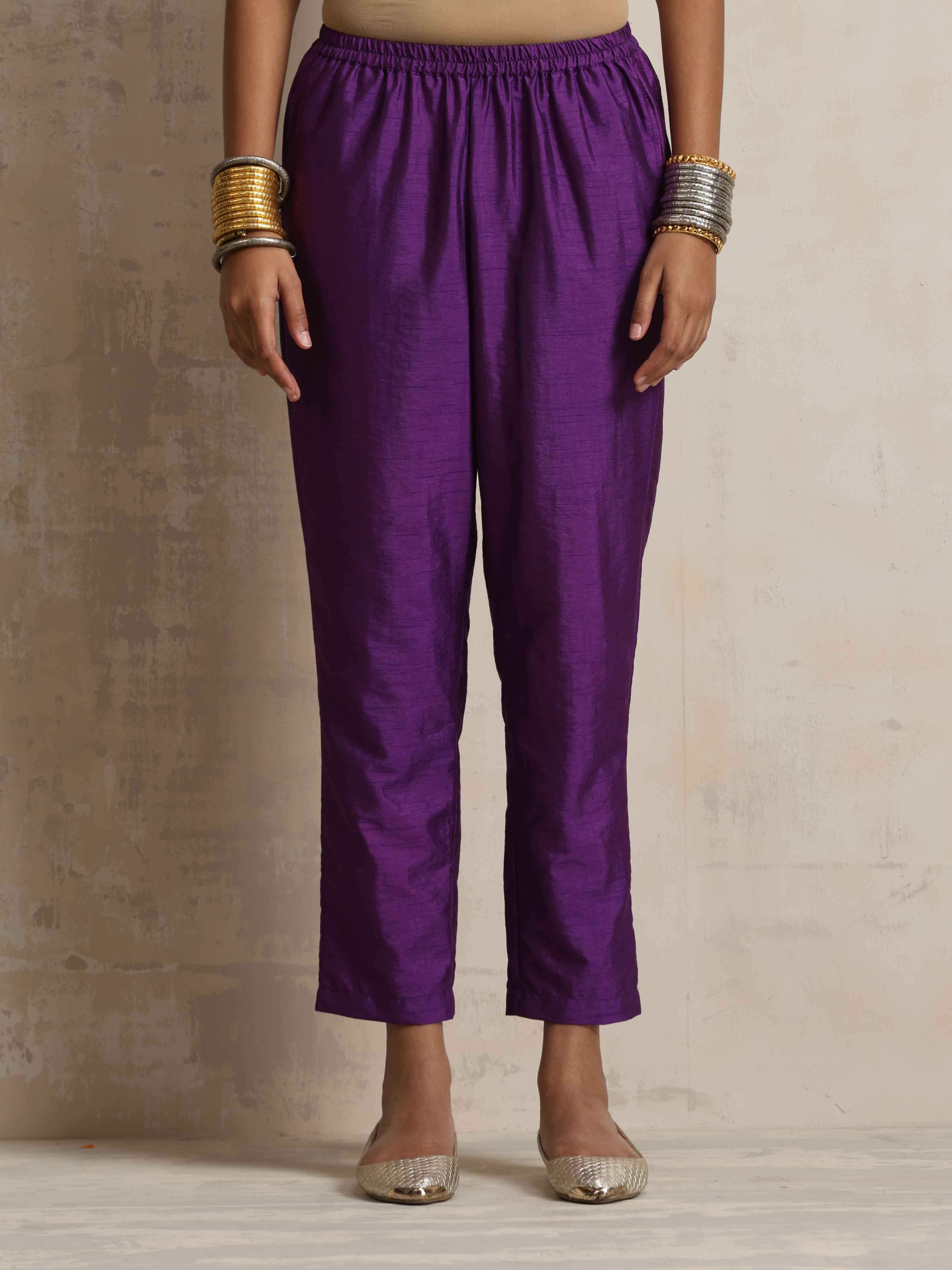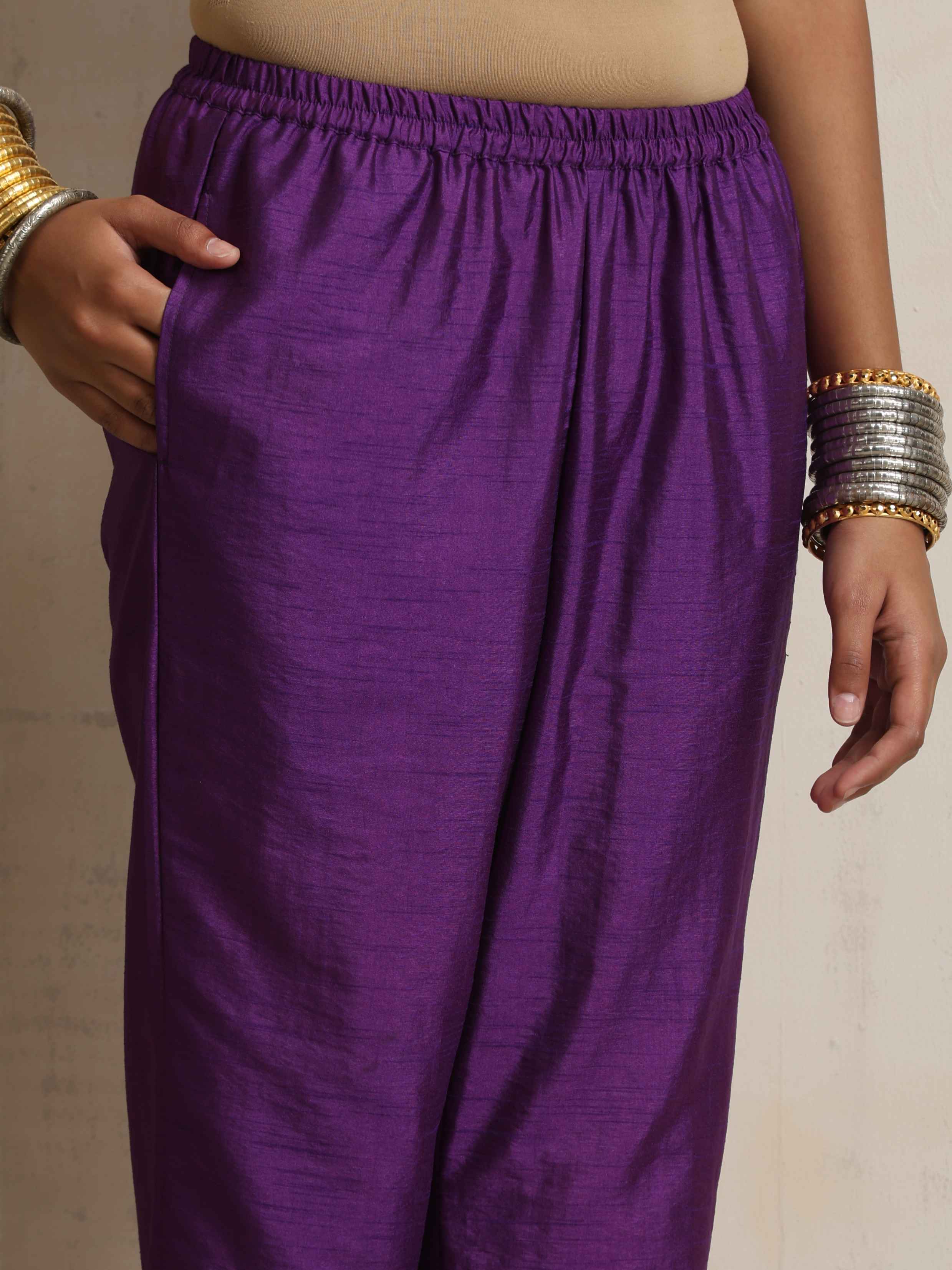 • Elevate your style with this purple silk blend flared kurta paired perfectly with purple silk blend elasticated waist pants.