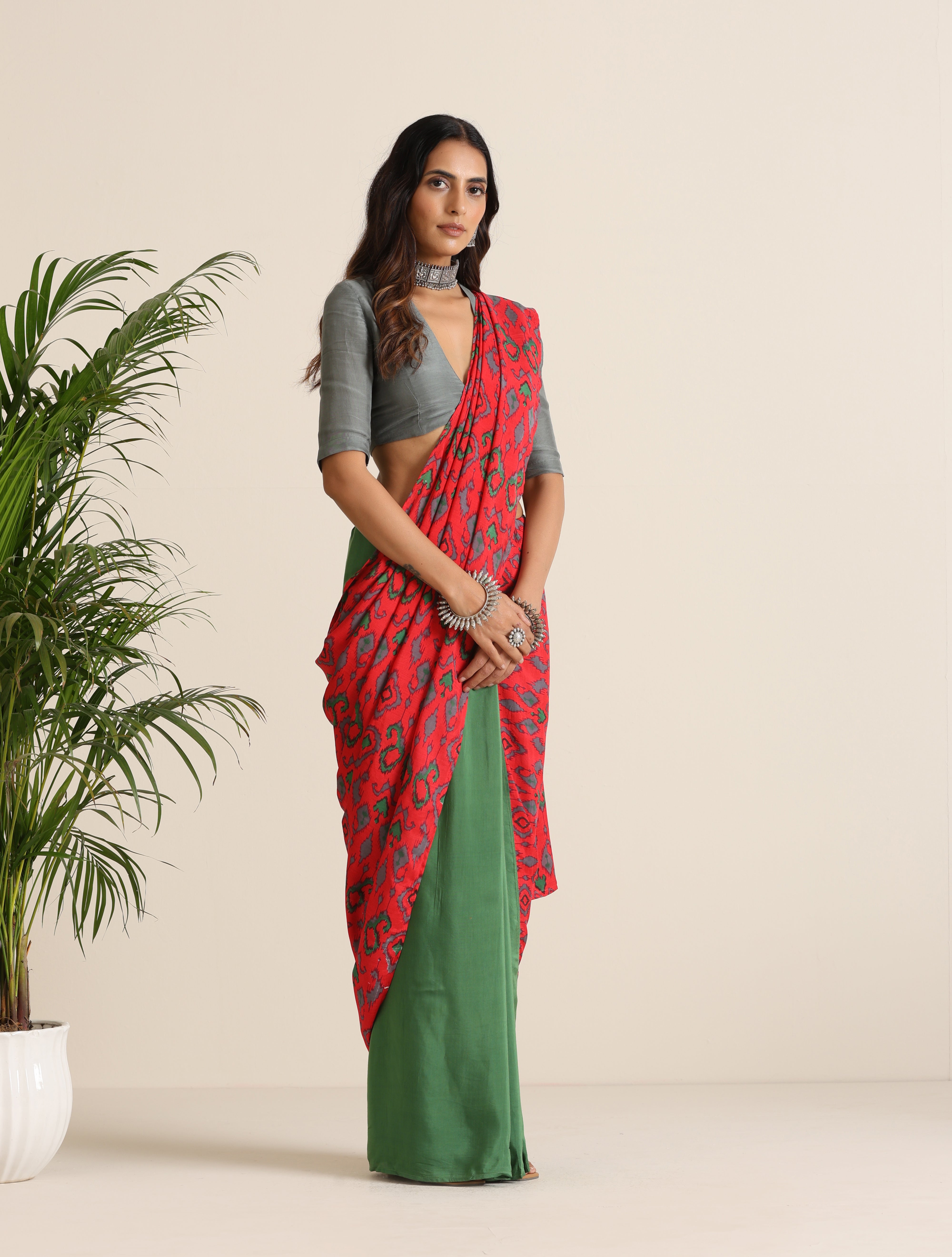 • Muslin Ikat Paisley Printed pre-stitched saree with solid Muslin Silk.