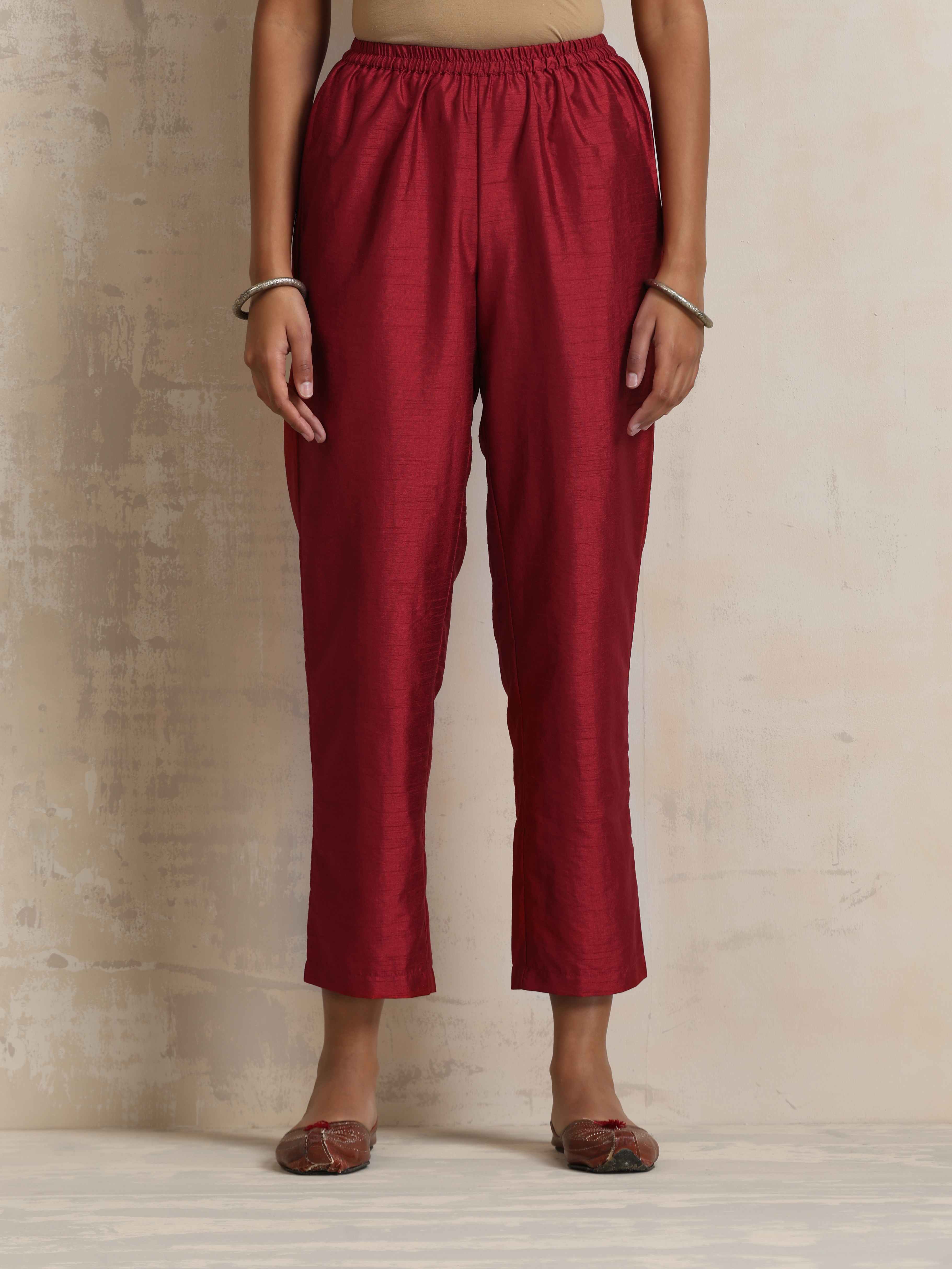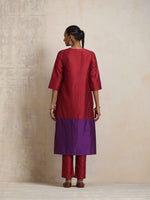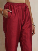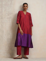 • Elevate your style with this red silk blend panelled kurta paired perfectly with red silk blend elasticated waist pants.