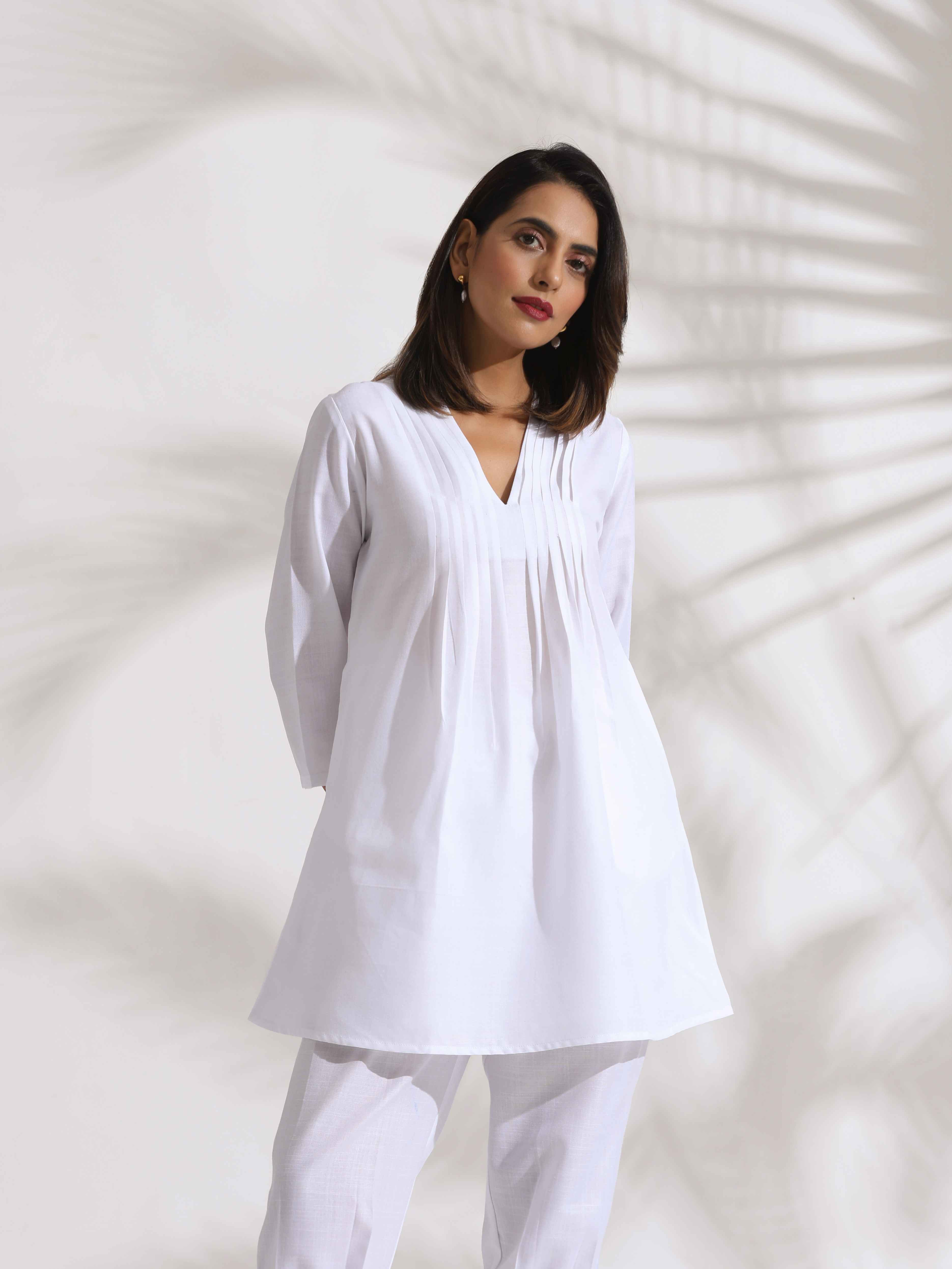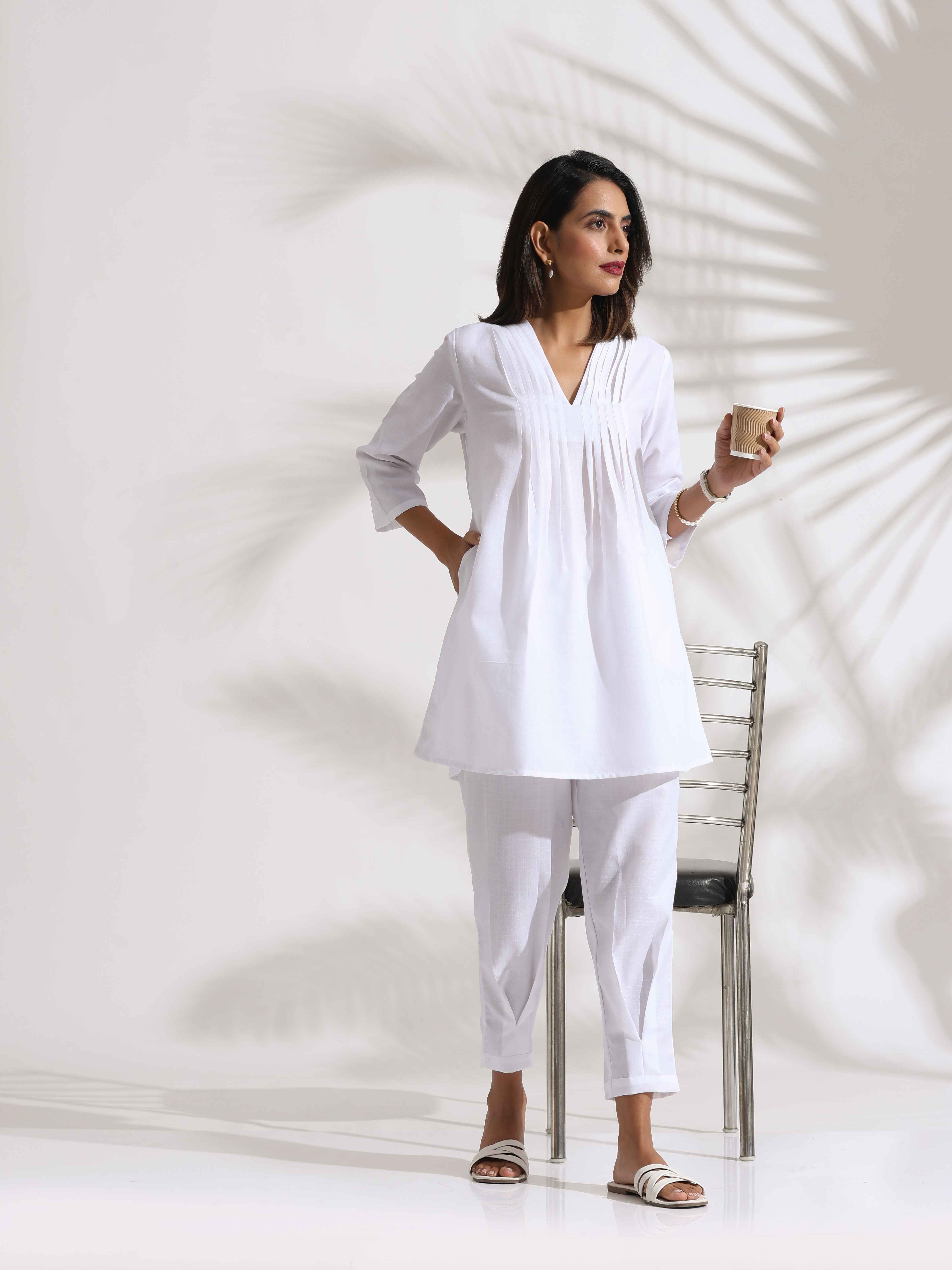 trueBrowns White Slub Co-ord SetDescription Elevate your style with this white V- neck pleated top with white pants, it's an ideal blend of eleganc...