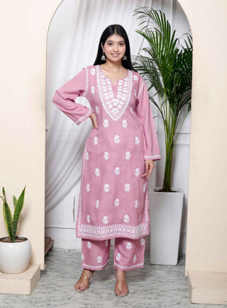 Miravan Women's Chikankari Embroidery Pink Straight Kurta & Palazzo Set