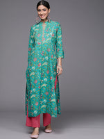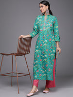 Varanga Women Turq Printed Cotton Kurta With Silver Gotta Lace Detailings - S