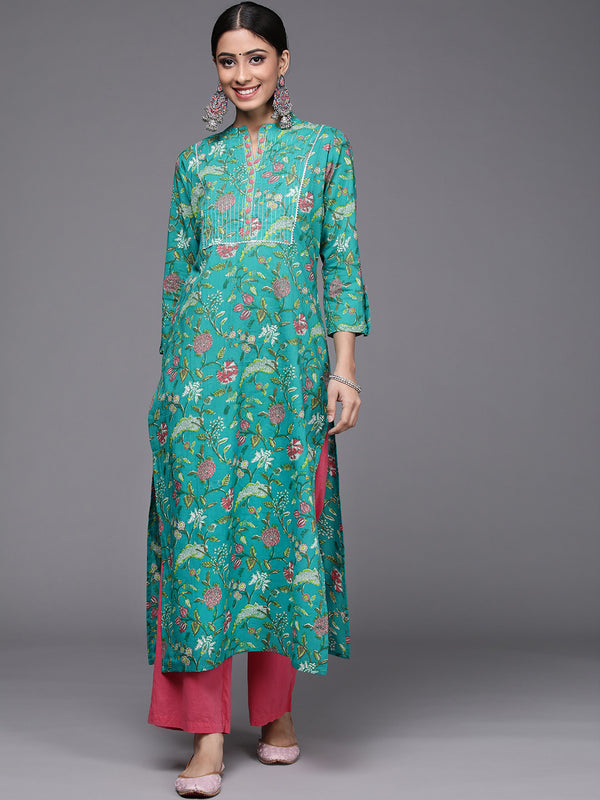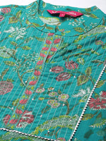 Varanga Women Turq Printed Cotton Kurta With Silver Gotta Lace Detailings