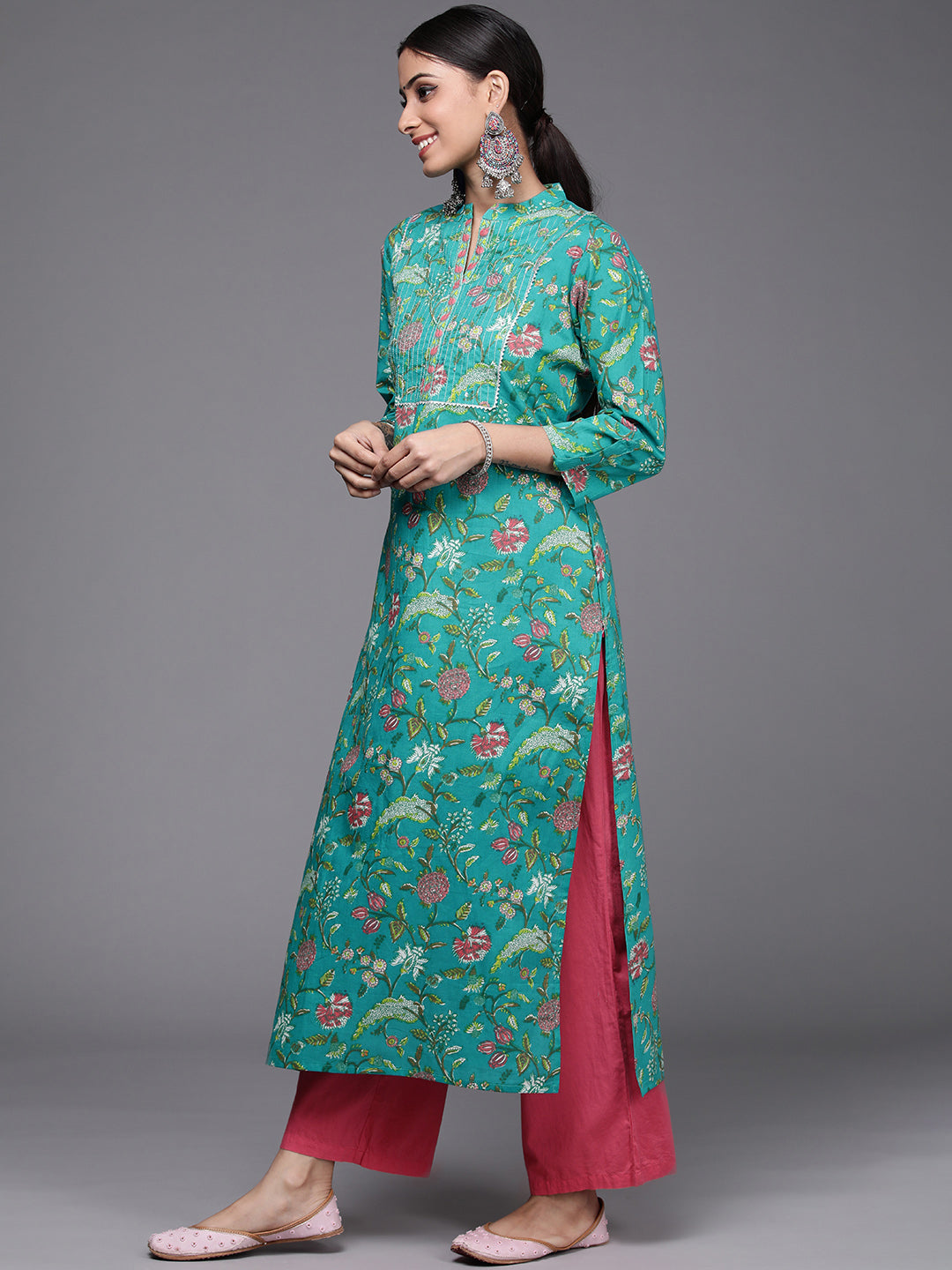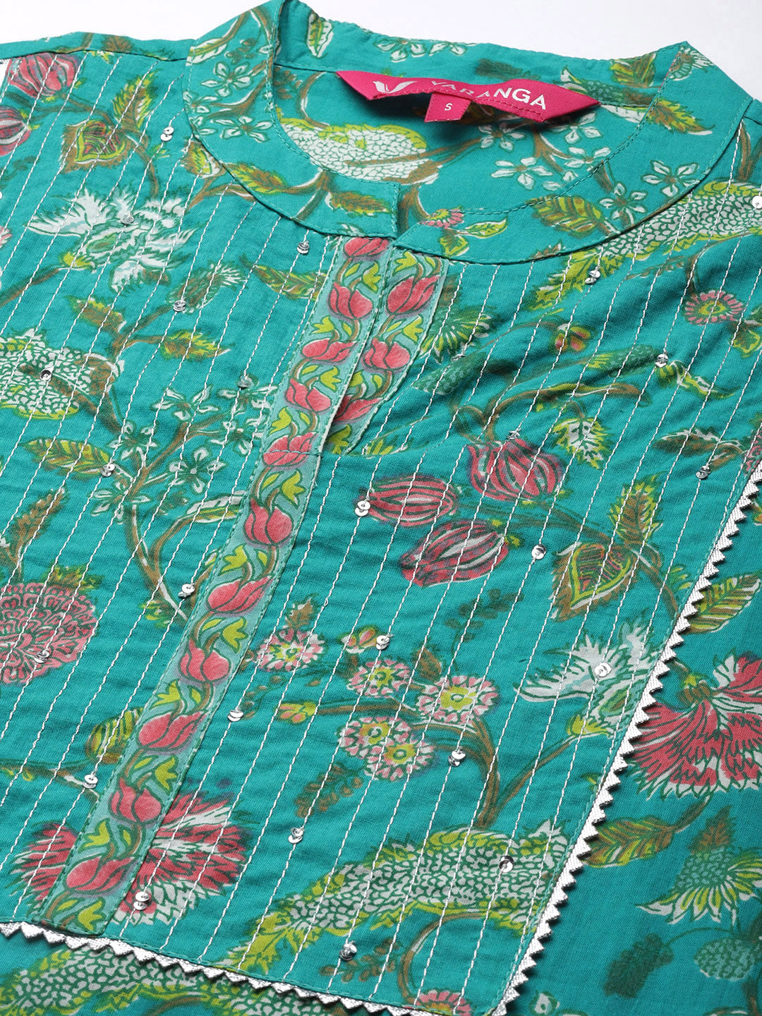 Varanga Women Turq Printed Cotton Kurta With Silver Gotta Lace Detailings About the product: Turquoise cotton floral printed kurta with silver got...