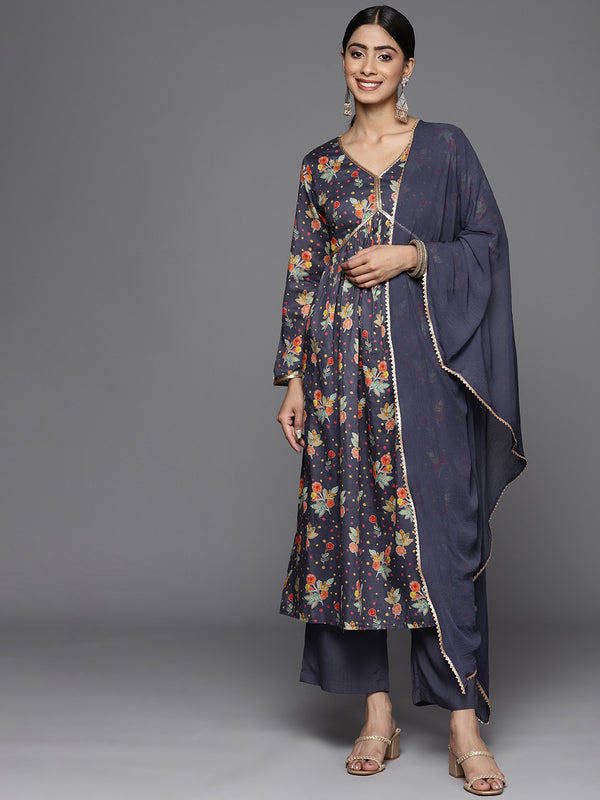 Violet Floral Printed A-Line Kurta, V-Neck Sequin Embellished, Three Quater Sleeves, Paired With Tonal Bottom And Chiffon Solid Dupatta,