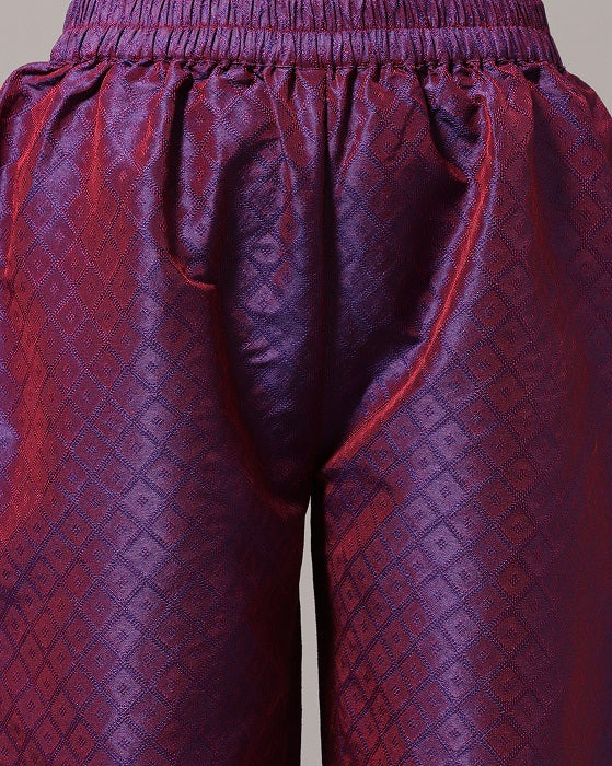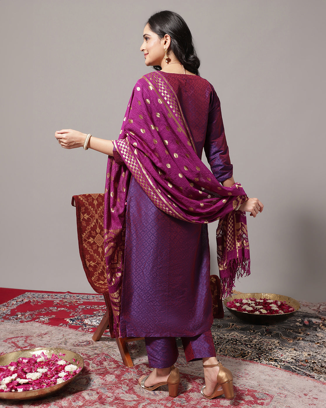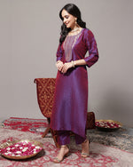 Varanga Women Voilet Zari Embroidered Kurta With Three Quater Sleeves Paired With Tonal Bottom And Dupatta - S