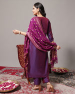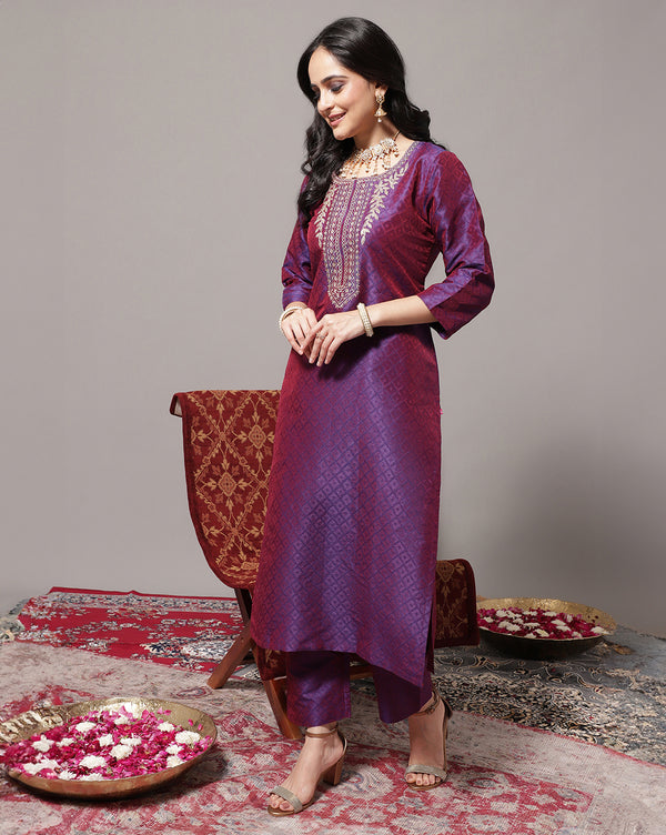 Voilet Round Neck, Zari Embroidered In Yoke, Three Quarter Sleeves, Straight Kurta Paired With Solid Bottom And Dupatta