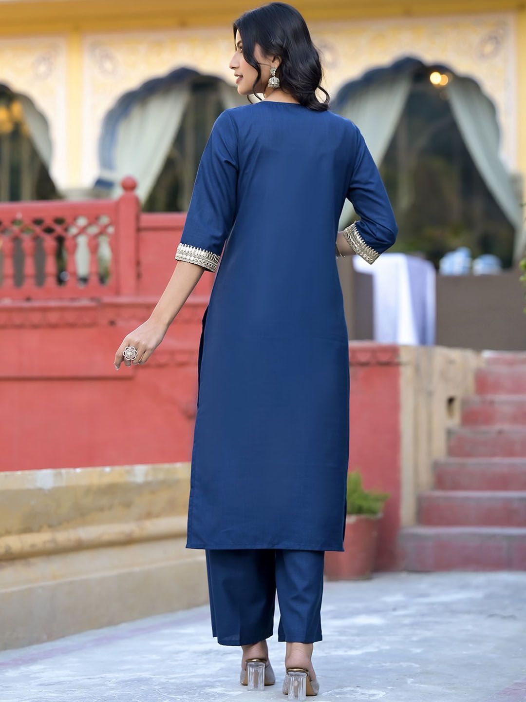 Vishudh Teal & Gold Toned Round Neck Regular Kurta with Palazzos & With Dupatta - Distacart